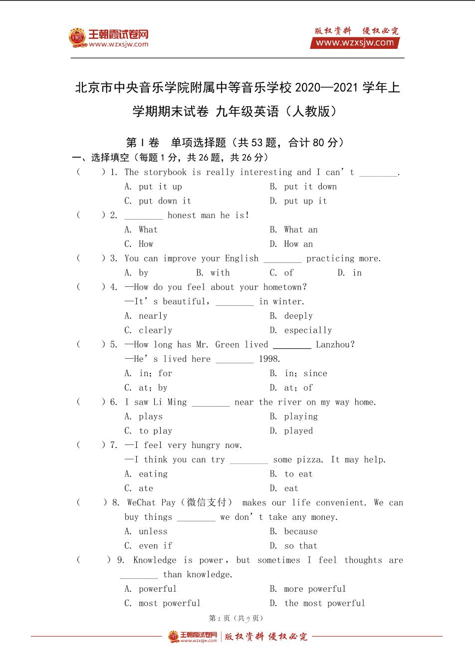 北京市中央音乐学院附属中等音乐学校 2020—2021学年九年级上学期期末英语试卷(人教版)