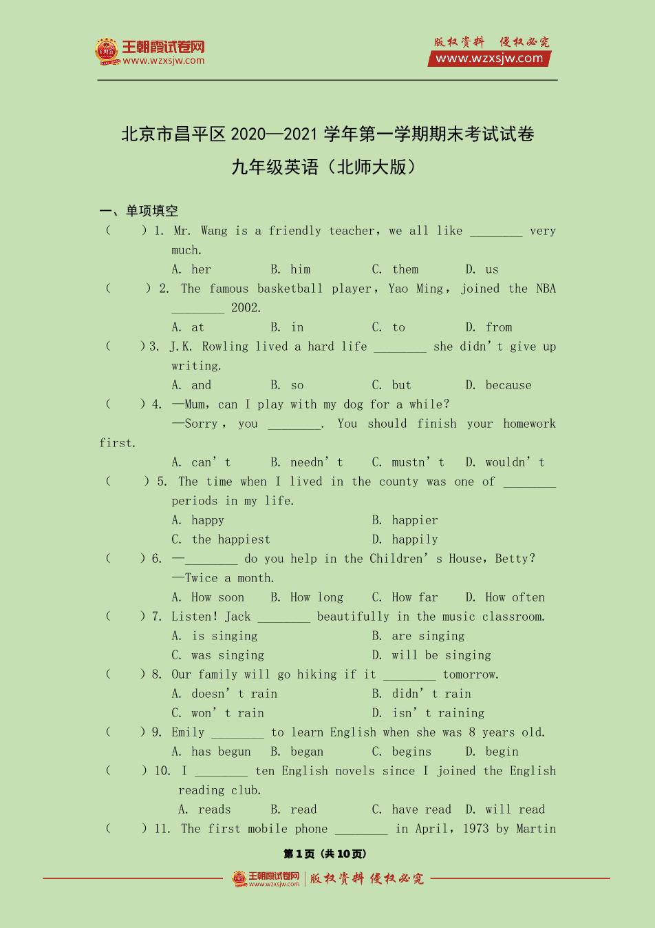 北京市昌平区2020—2021学年第一学期期末考试试卷九年级英语(北师大版)