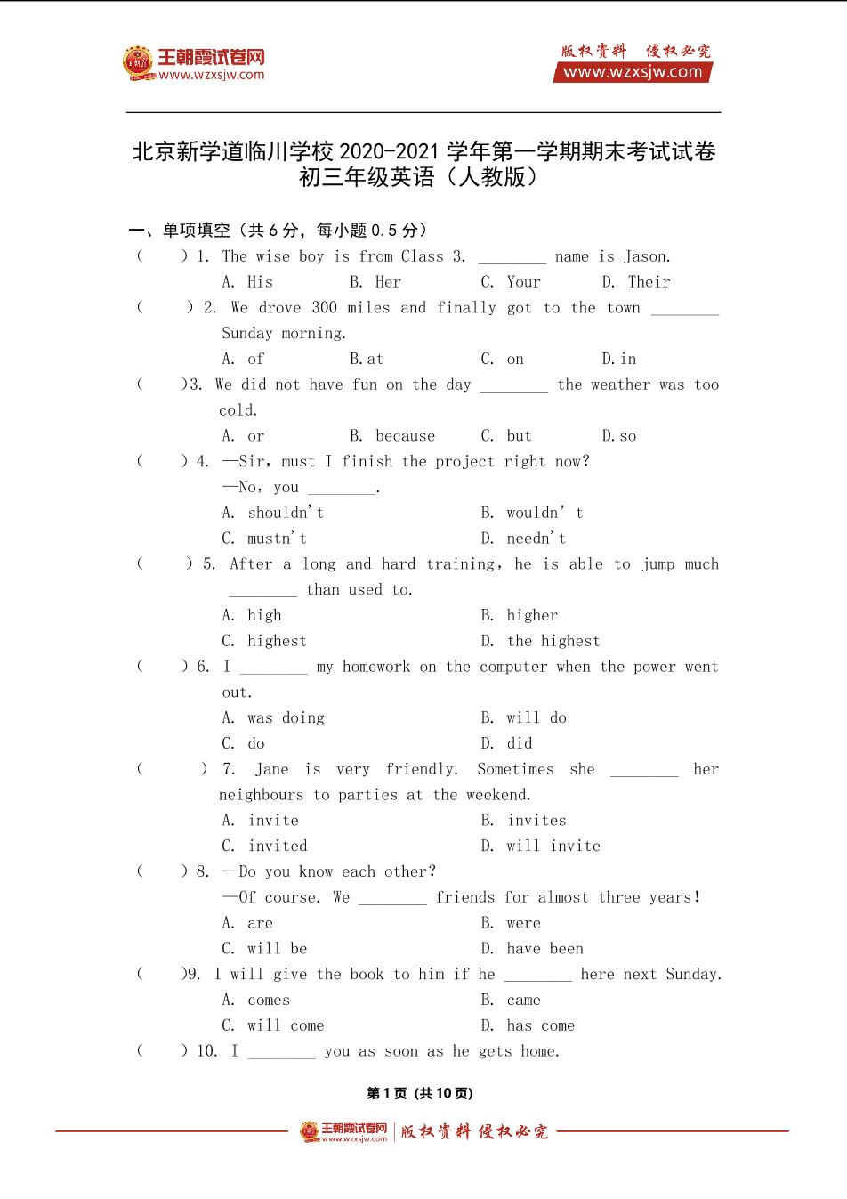 北京市昌平区新学道临川学校2020-2021学年九年级上学期期末考试英语试题(人教版)