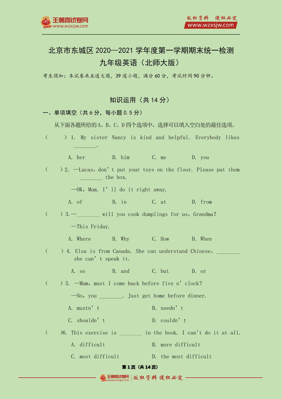 北京市东城区2020—2021学年九年级上学期期末统一测试英语试题(北师大版)