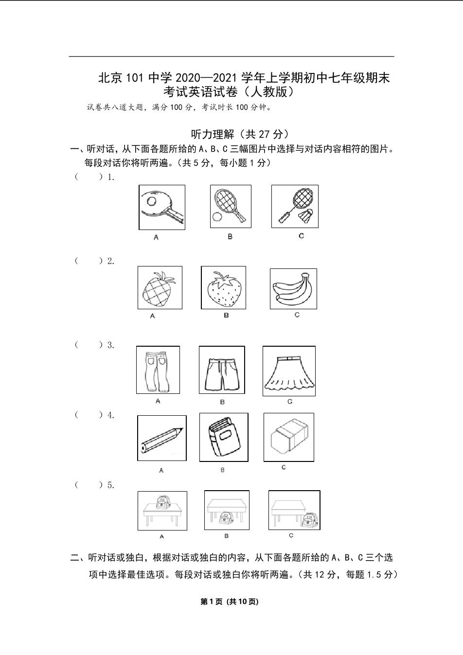 北京市101中学2020—2021学年上学期初中七年级期末考试英语试卷(人教版)
