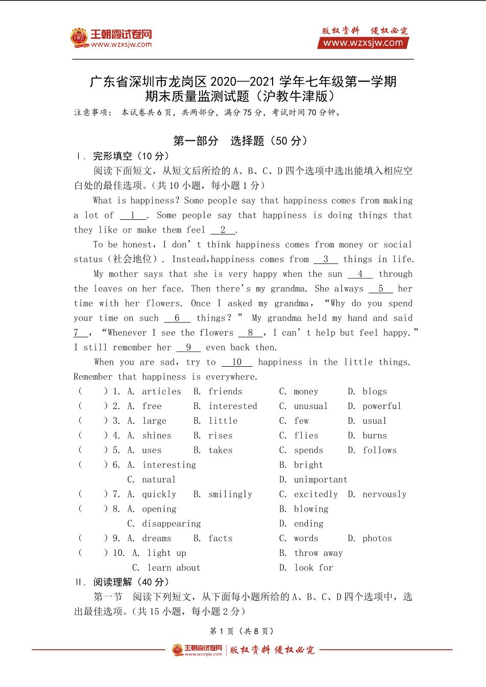 广东省深圳市龙岗区2020—2021学年七年级第一学期英语期末质量监测试题(沪教牛津版)