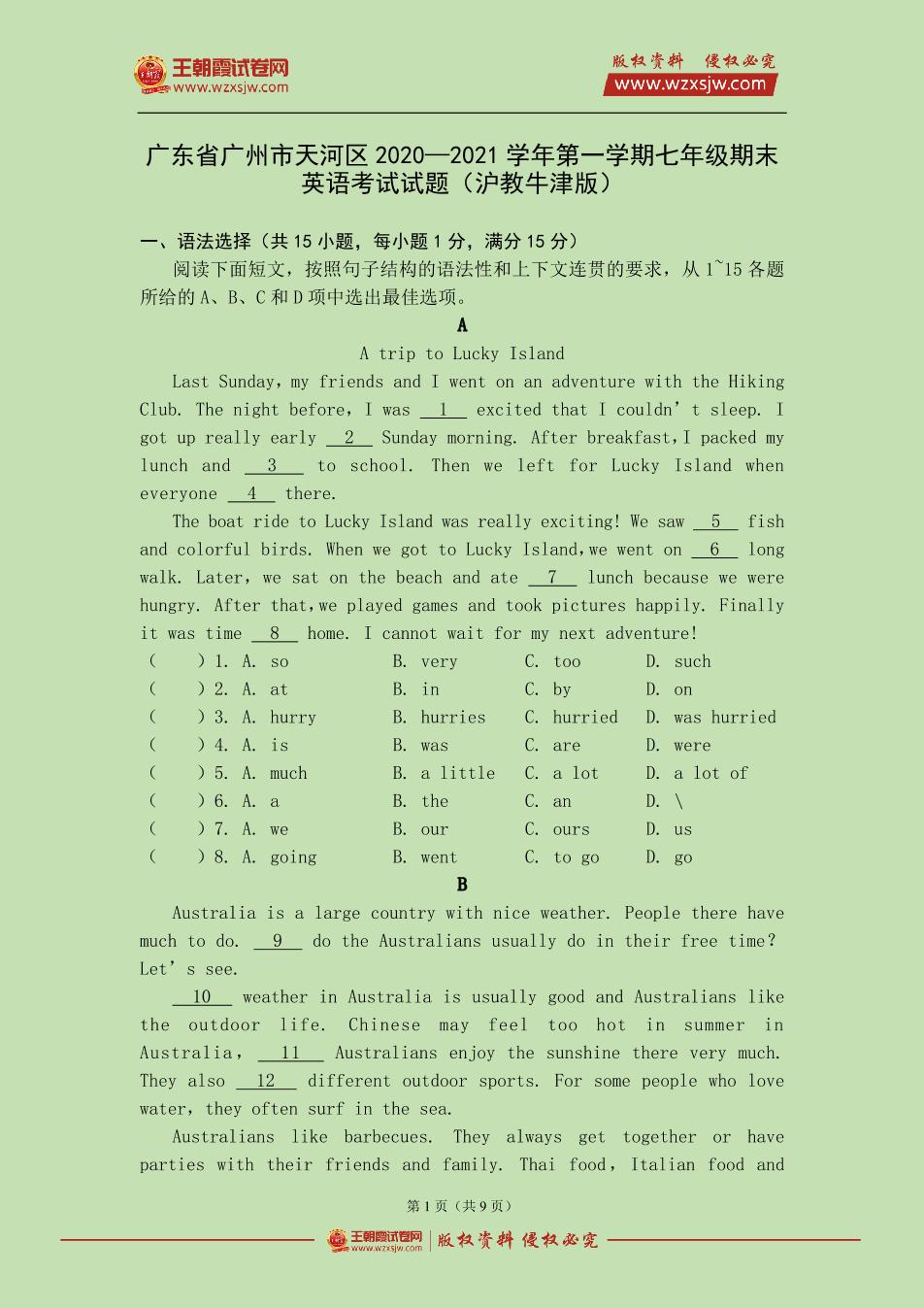 广东省广州市天河区2020—2021学年第一学期七年级期末英语考试试题(沪教牛津版)