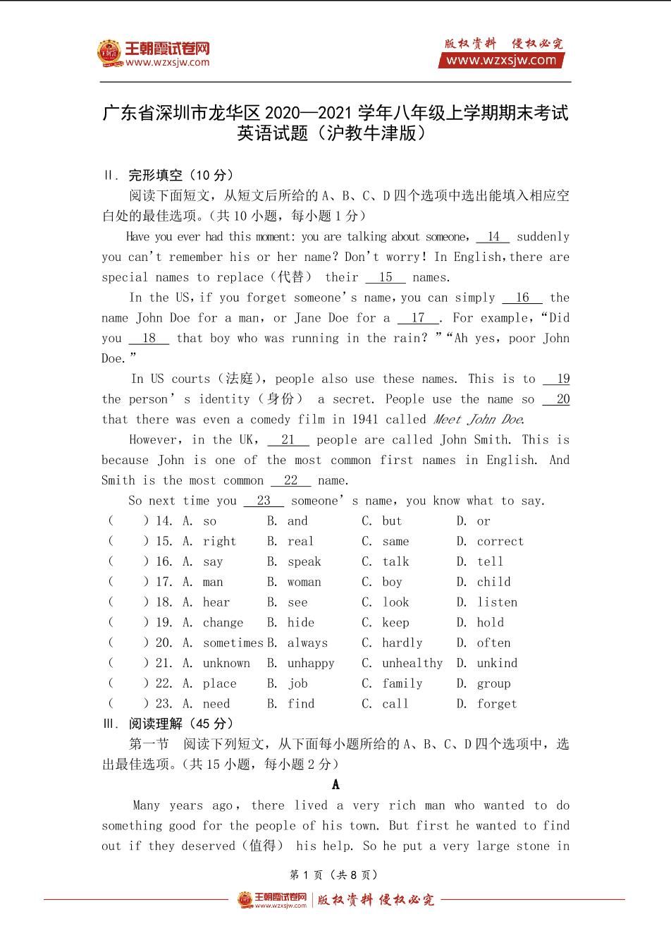 广东省深圳市龙华区2020—2021学年八年级上学期期末考试英语试题(沪教牛津版)