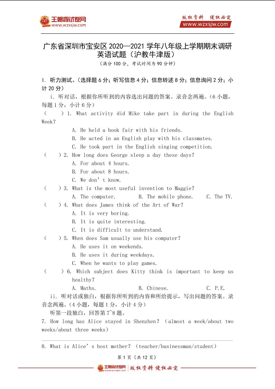广东省深圳市宝安区2020—2021学年八年级上学期期末调研英语试题(沪教牛津版)