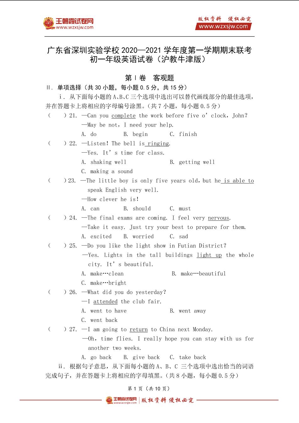 广东省深圳实验学校2020—2021学年度第一学期期末联考初一年级英语试卷(沪教牛津版)