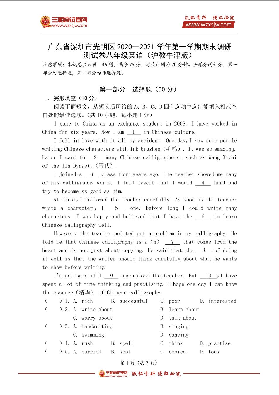 广东省深圳市光明区2020—2021学年第一学期期末调研测试卷八年级英语(沪教牛津版)