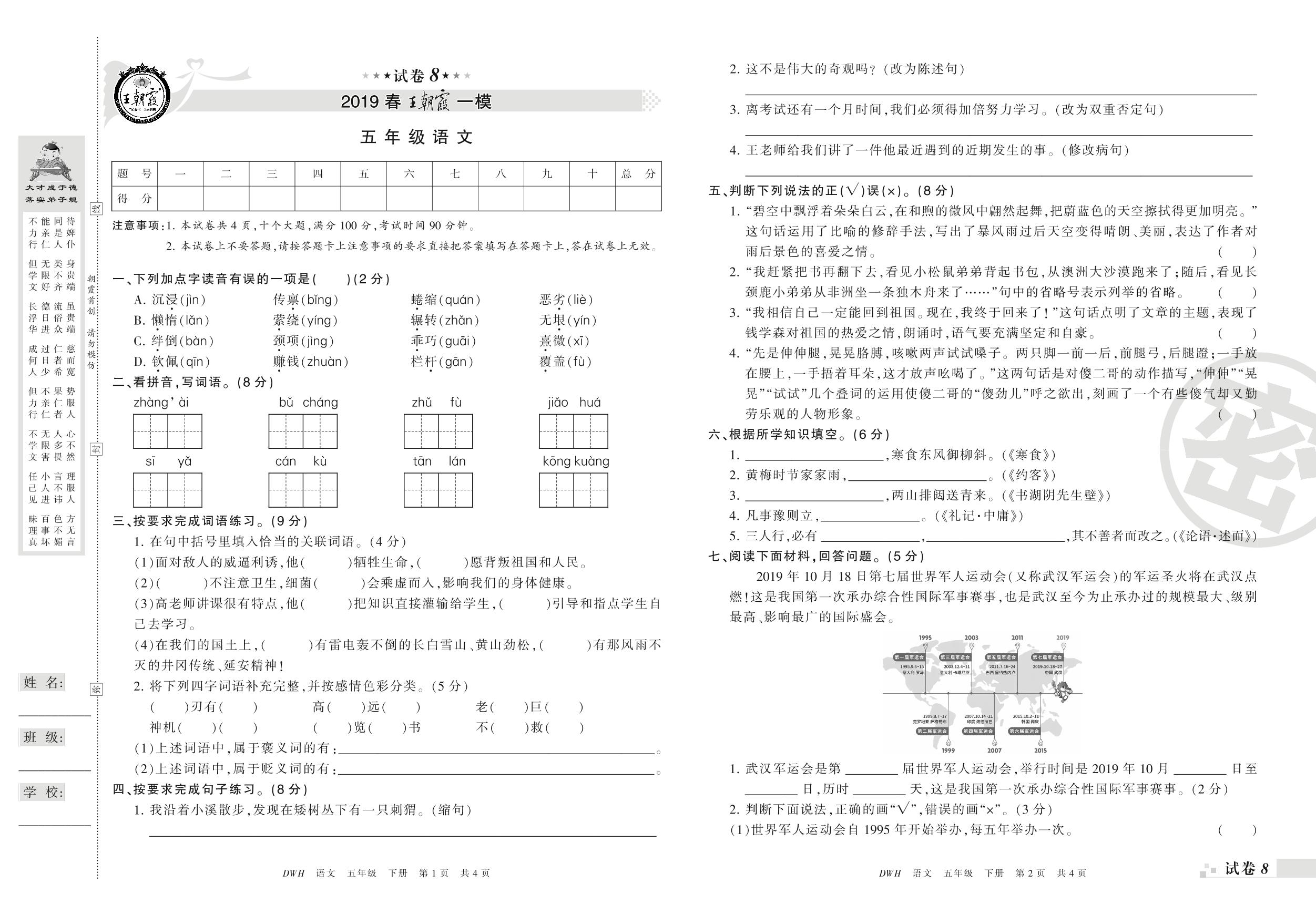 王朝霞期末模拟卷五年级下册语文(鄂教版)【8】