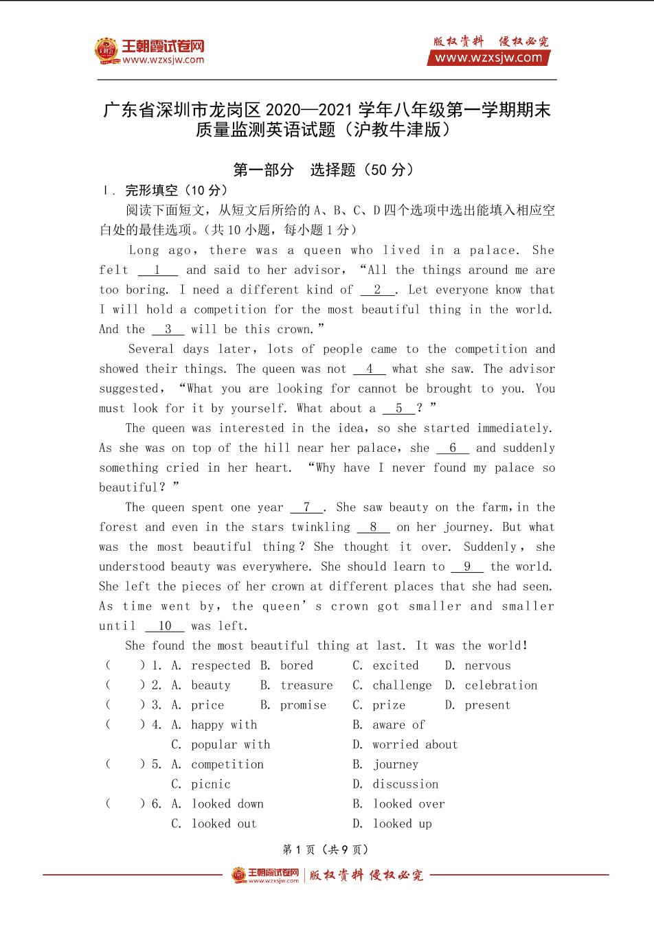 广东省深圳市龙岗区2020—2021学年八年级第一学期期末质量监测英语试题(沪教牛津版)