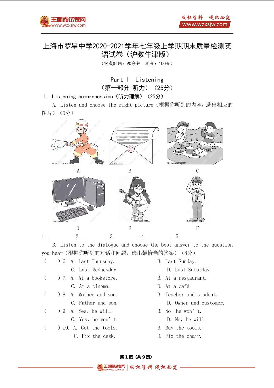 上海市罗星中学2020-2021学年七年级上学期期末质量检测英语试卷(沪教牛津版)