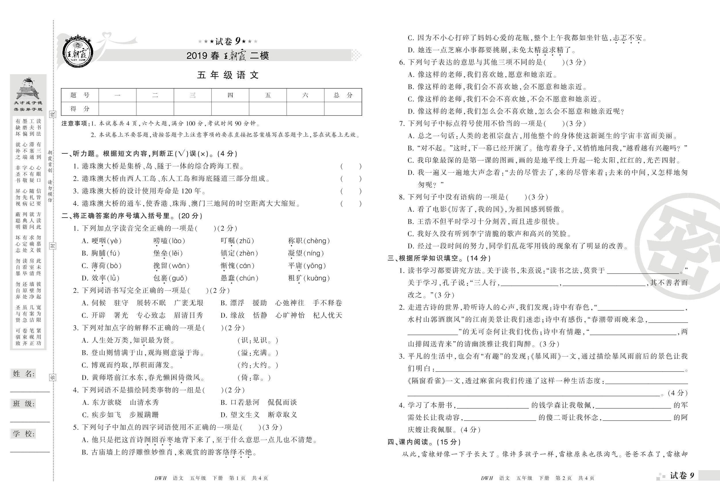 王朝霞期末模拟卷五年级下册语文(鄂教版)【9】