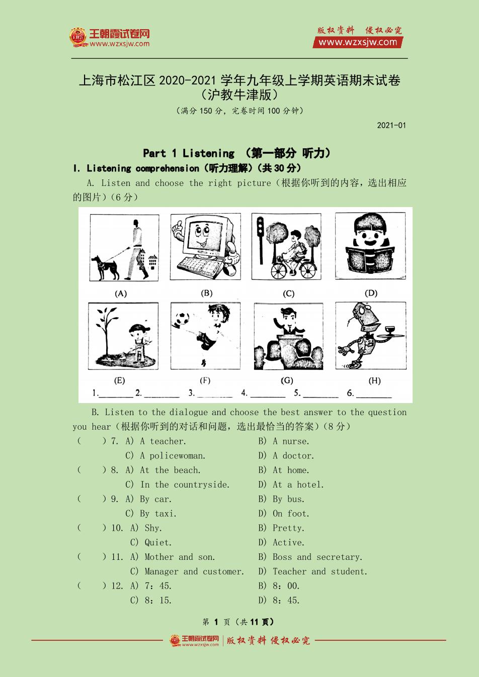 上海市松江区2020-2021学年九年级上学期英语期末试卷(沪教牛津版)