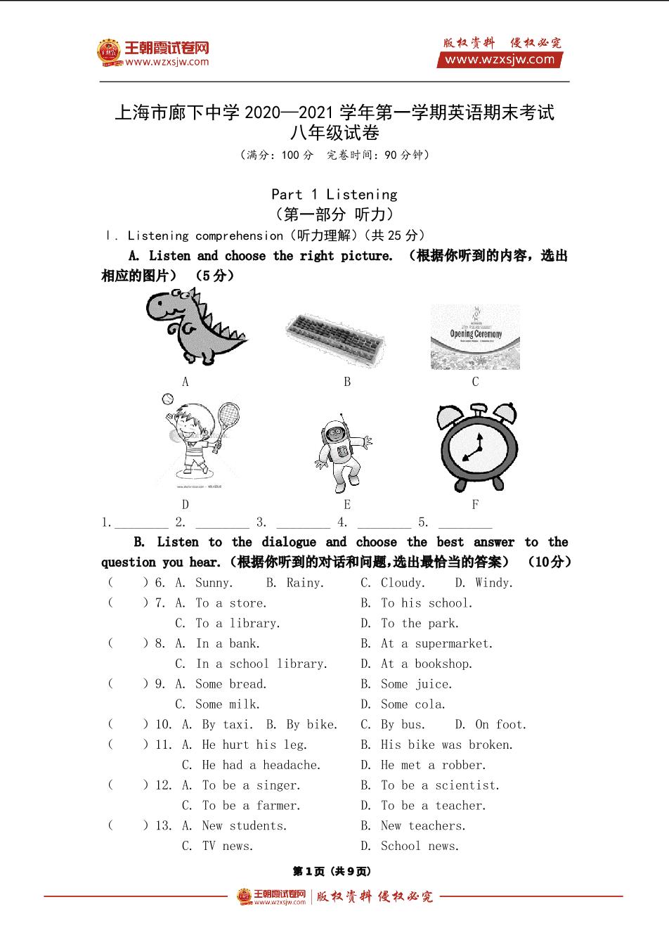 上海市廊下中学2020—2021学年八年级上学期英语期末质量检测卷(沪教牛津版)