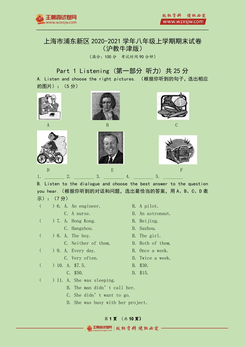 上海市浦东新区2020-2021学年八年级上学期期末英语试卷(沪教牛津版)