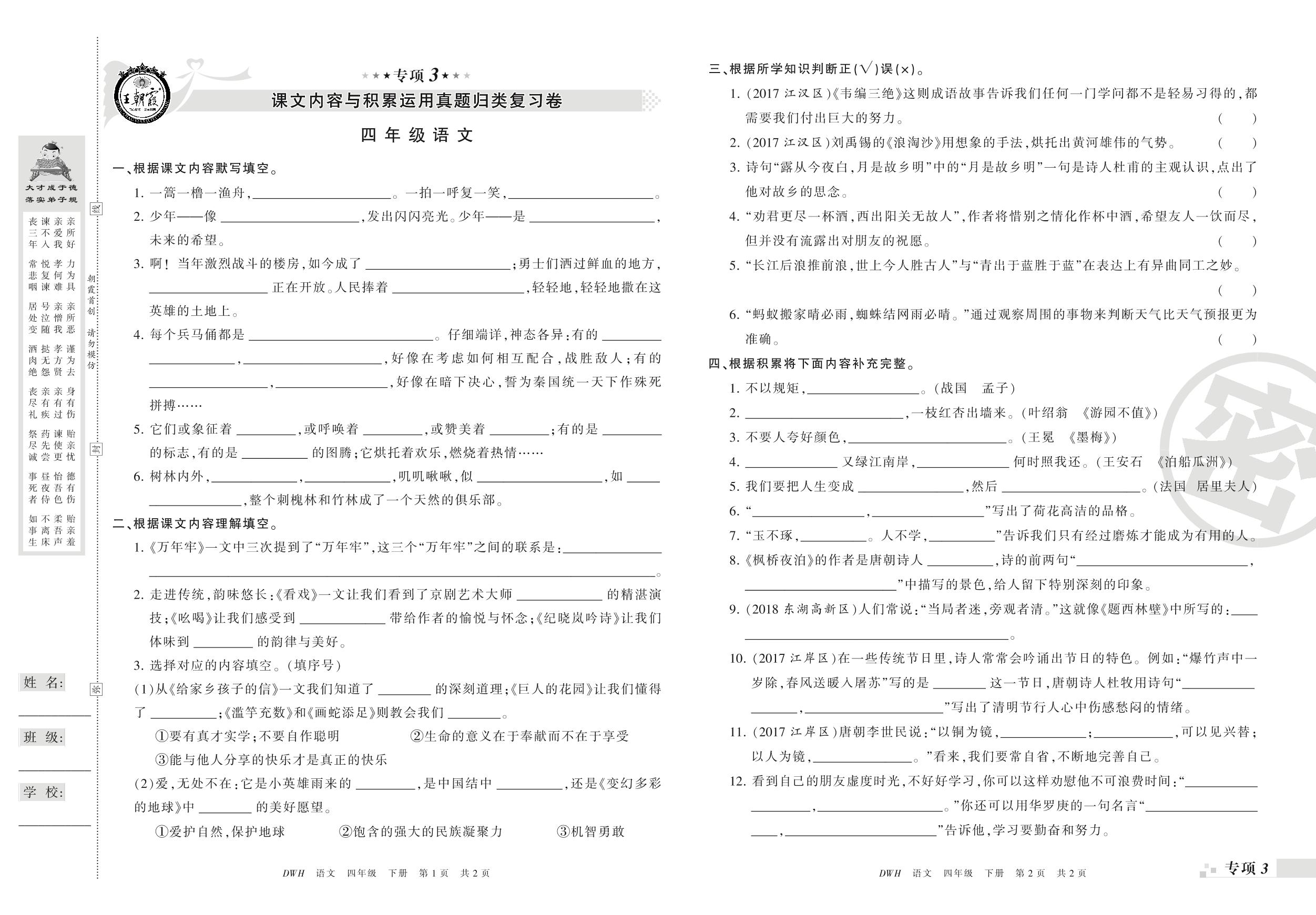 王朝霞期末专项卷——课文内容与积累运用、课内阅读与写作真题归类复习四年级下册语文(鄂教版)_R210801202256【0】