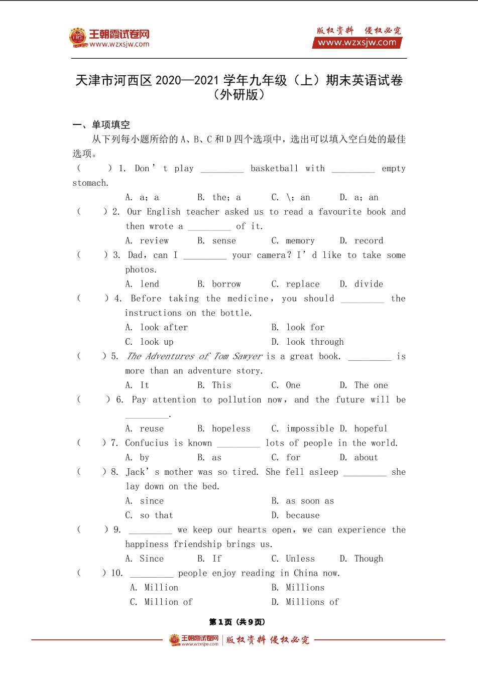 天津市河西区2020—2021学年九年级(上)期末英语试卷(外研版)