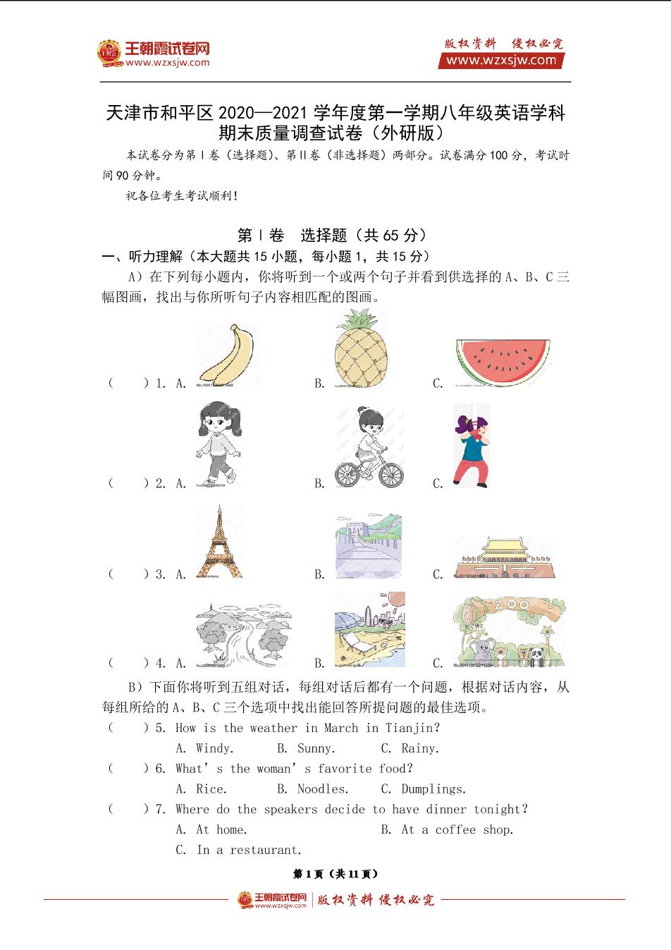 天津市和平区2020—2021学年度第一学期八年级英语学科期末质量调查试卷(外研版)