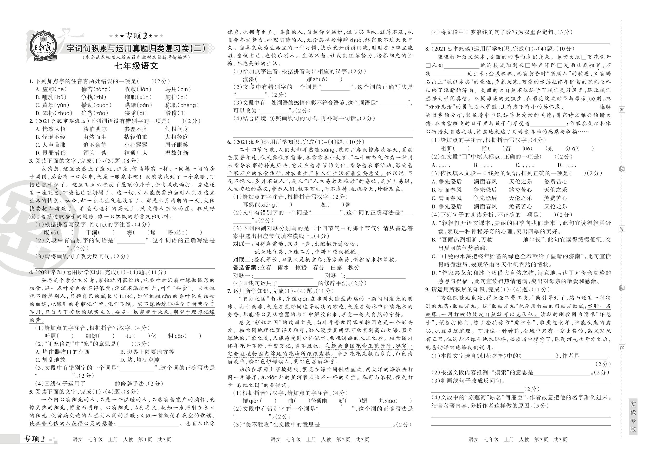 王朝霞期末专项卷——字词句积累与运用真题归类复习卷(二)七年级上册语文(人教版)【2】