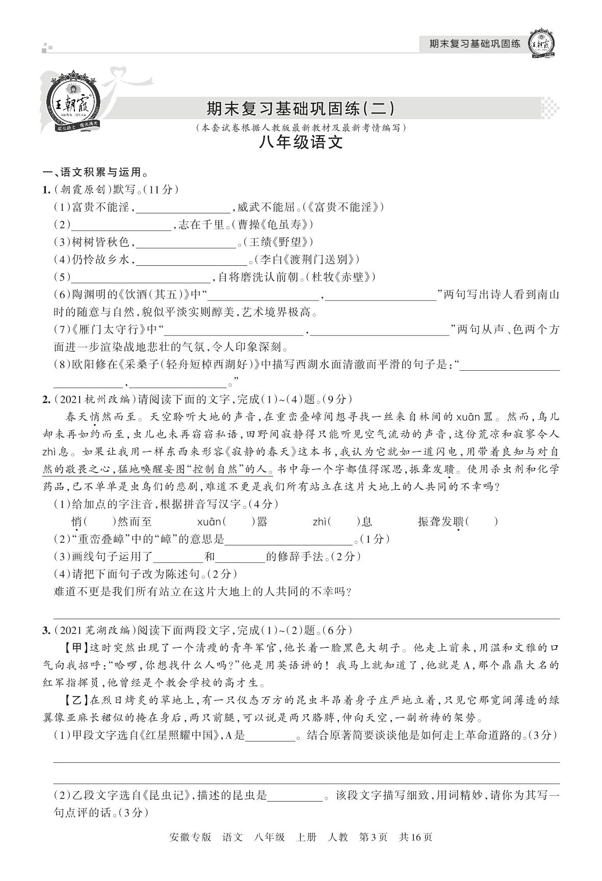 王朝霞期末小卷——期末复习基础巩固练(二)八年级上册语文(人教版)_R211116105457775【2】