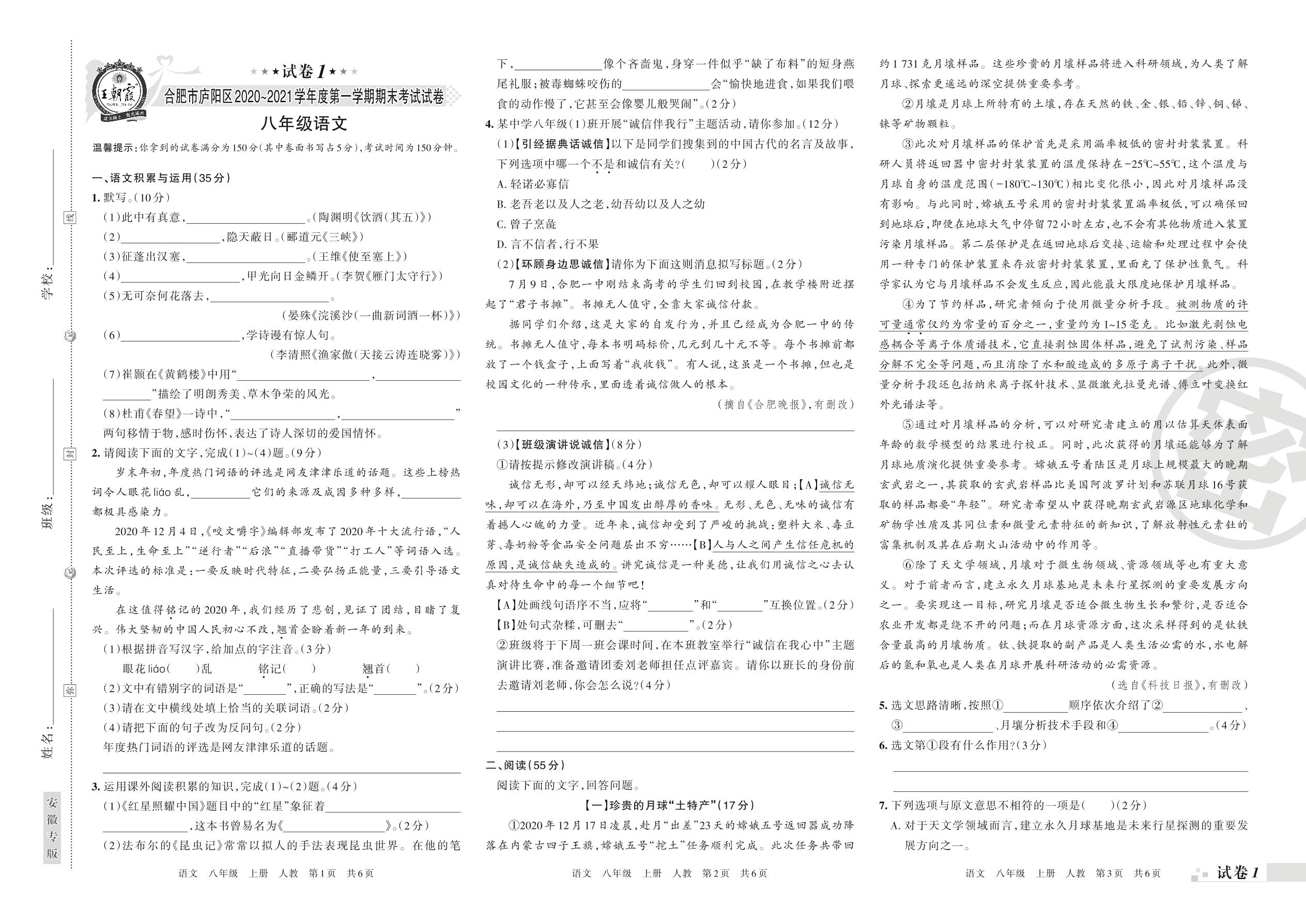 合肥市庐阳区2020~2021学年度第一学期期末考试试卷八年级语文(人教版)【1】