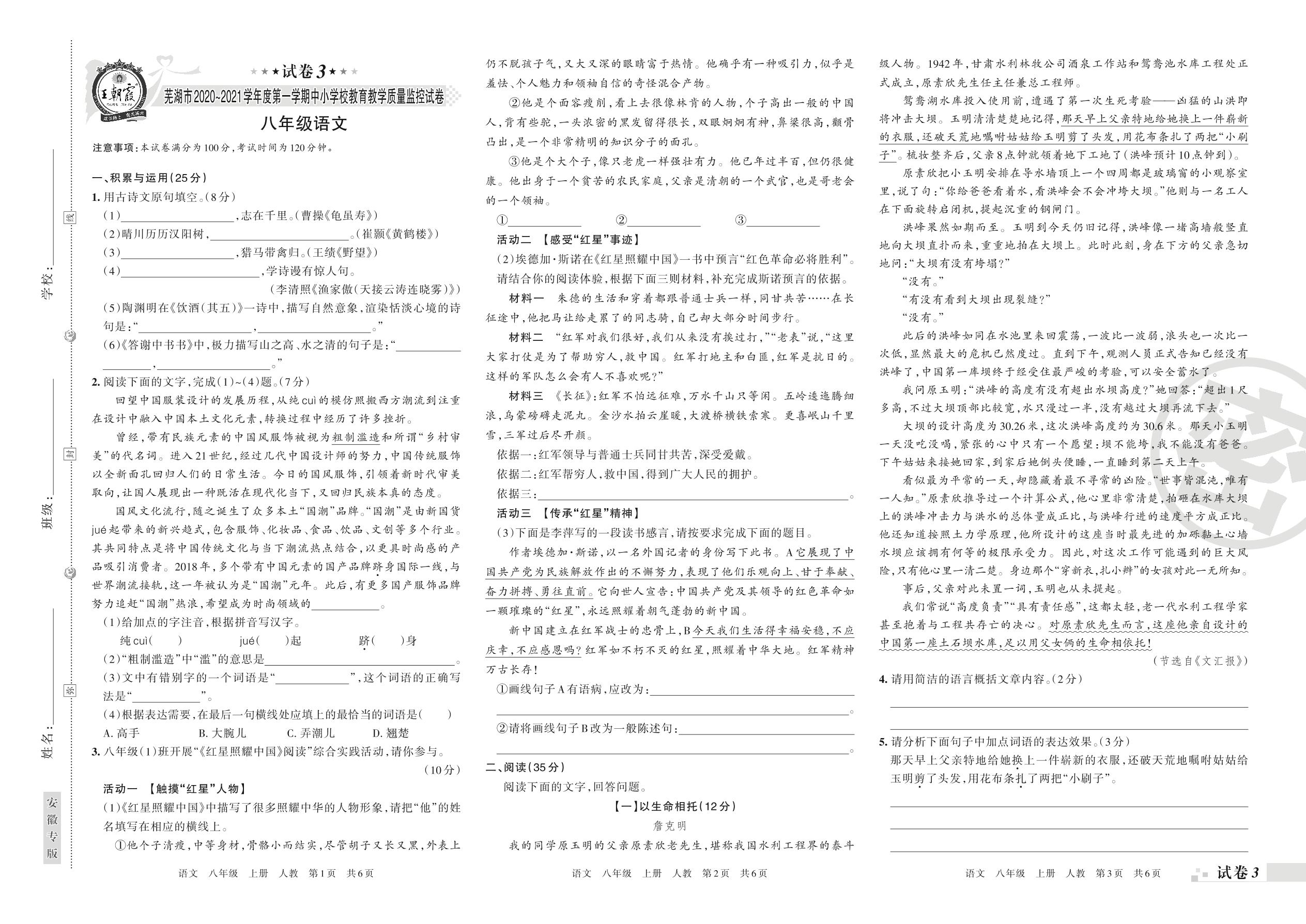 芜湖市2020~2021学年度第一学期中小学校教育教学质量监控试卷八年级语文(人教版)【3】