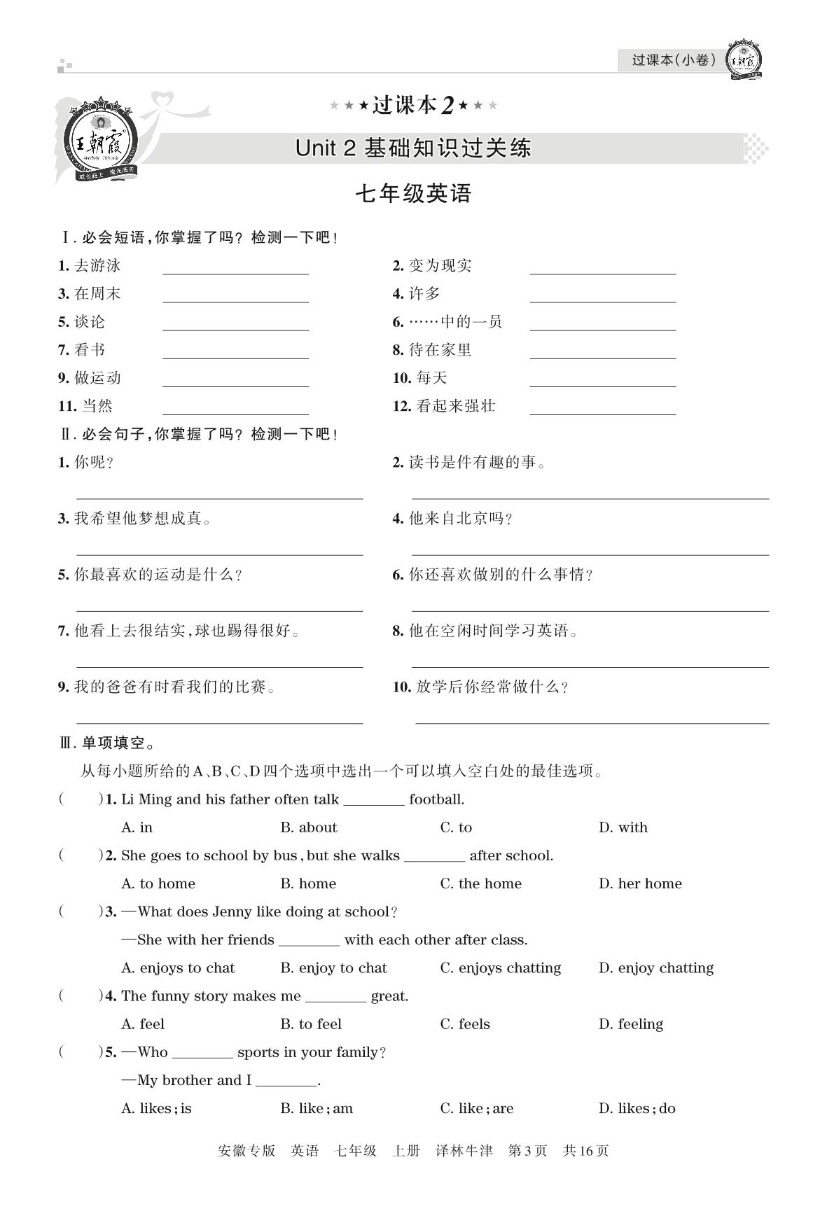 王朝霞期末过课本——Unit 2 基础知识过关练七年级上册英语(译林牛津版)【2】