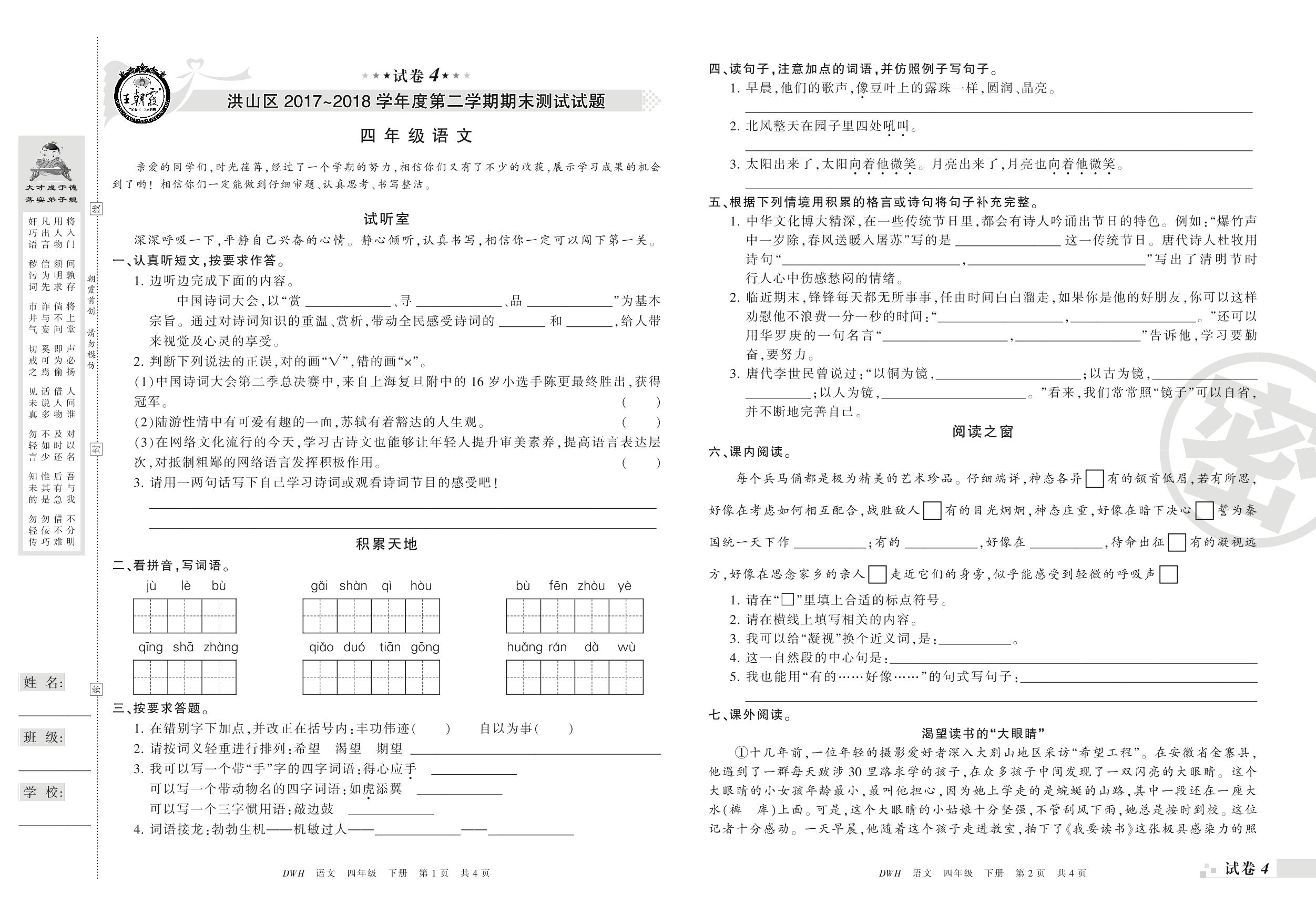 2017-2018学年第二学期武汉市洪山区四年级语文试卷(鄂教版)【4】