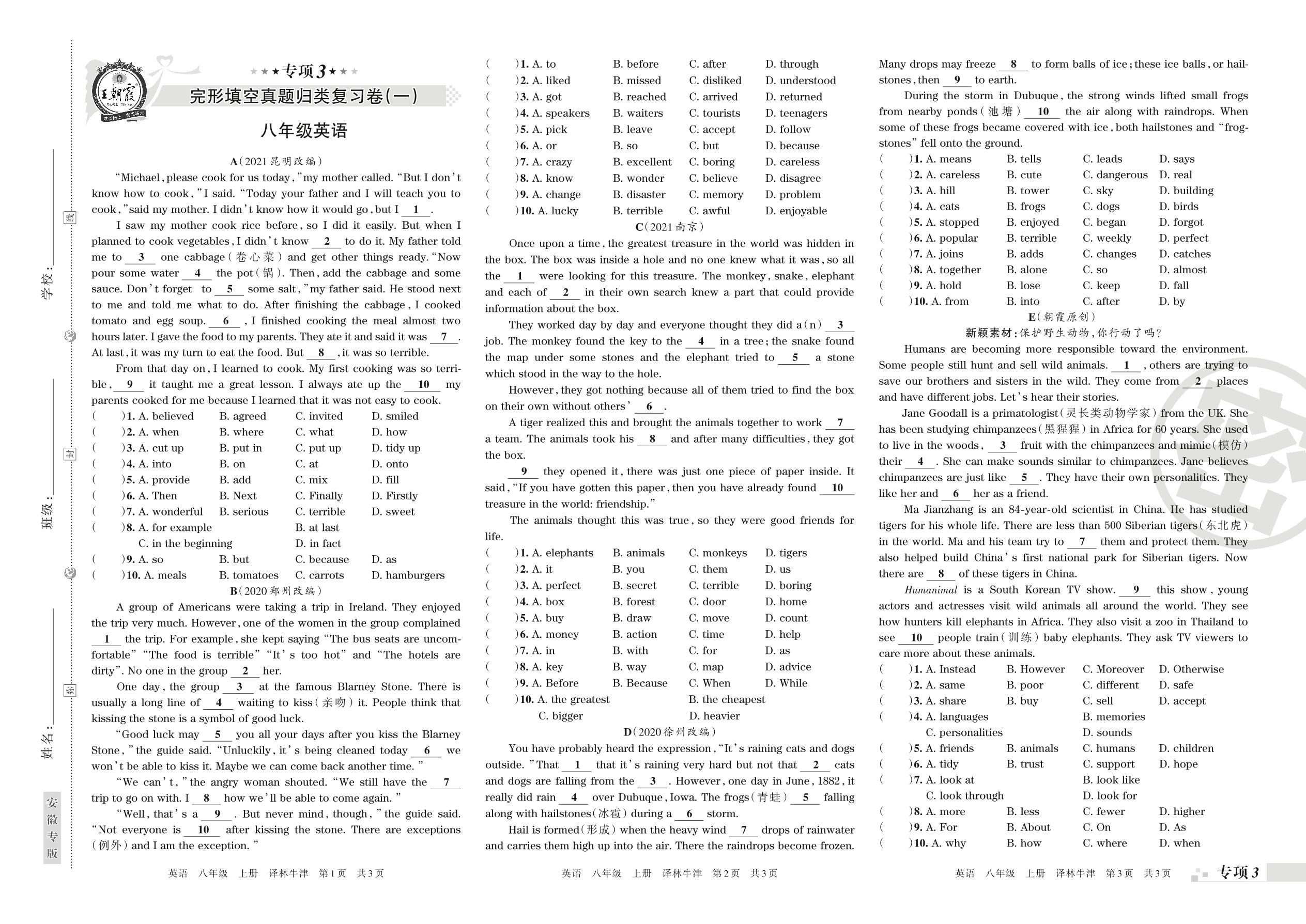 王朝霞期末专项卷——完形填空真题归类复习卷(一)八年级上册英语(译林牛津版)【3】