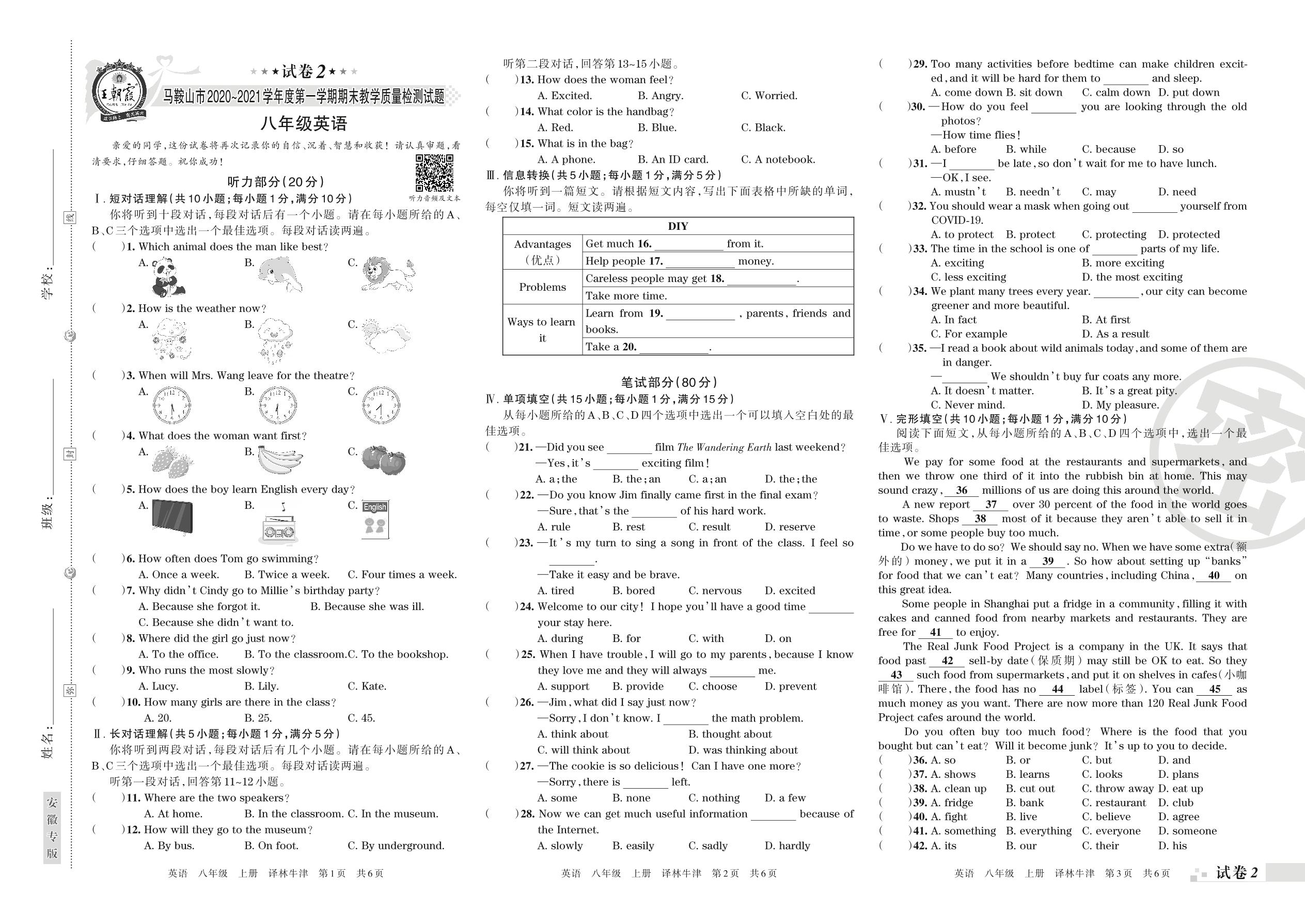 马鞍山市2020~2021学年度第一学期期末教学质量检测试题八年级英语(译林牛津版)【2】