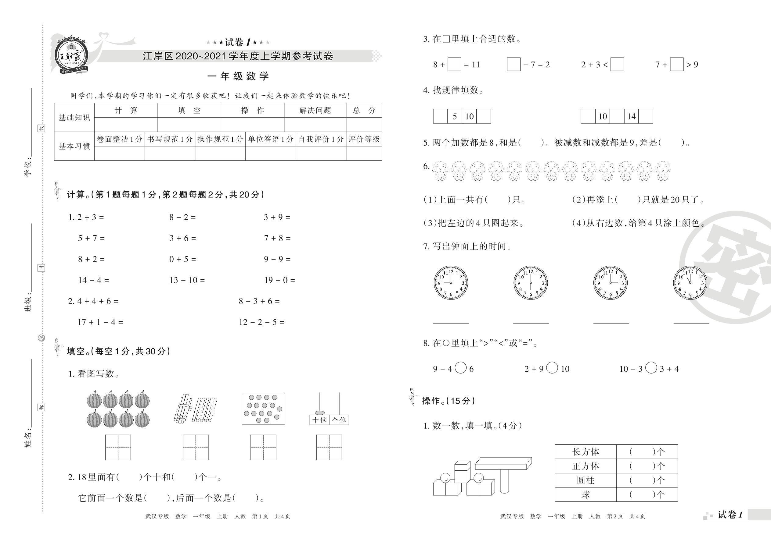 江岸区2020~2021学年度上学期参考试卷一年级数学(人教版)【1】