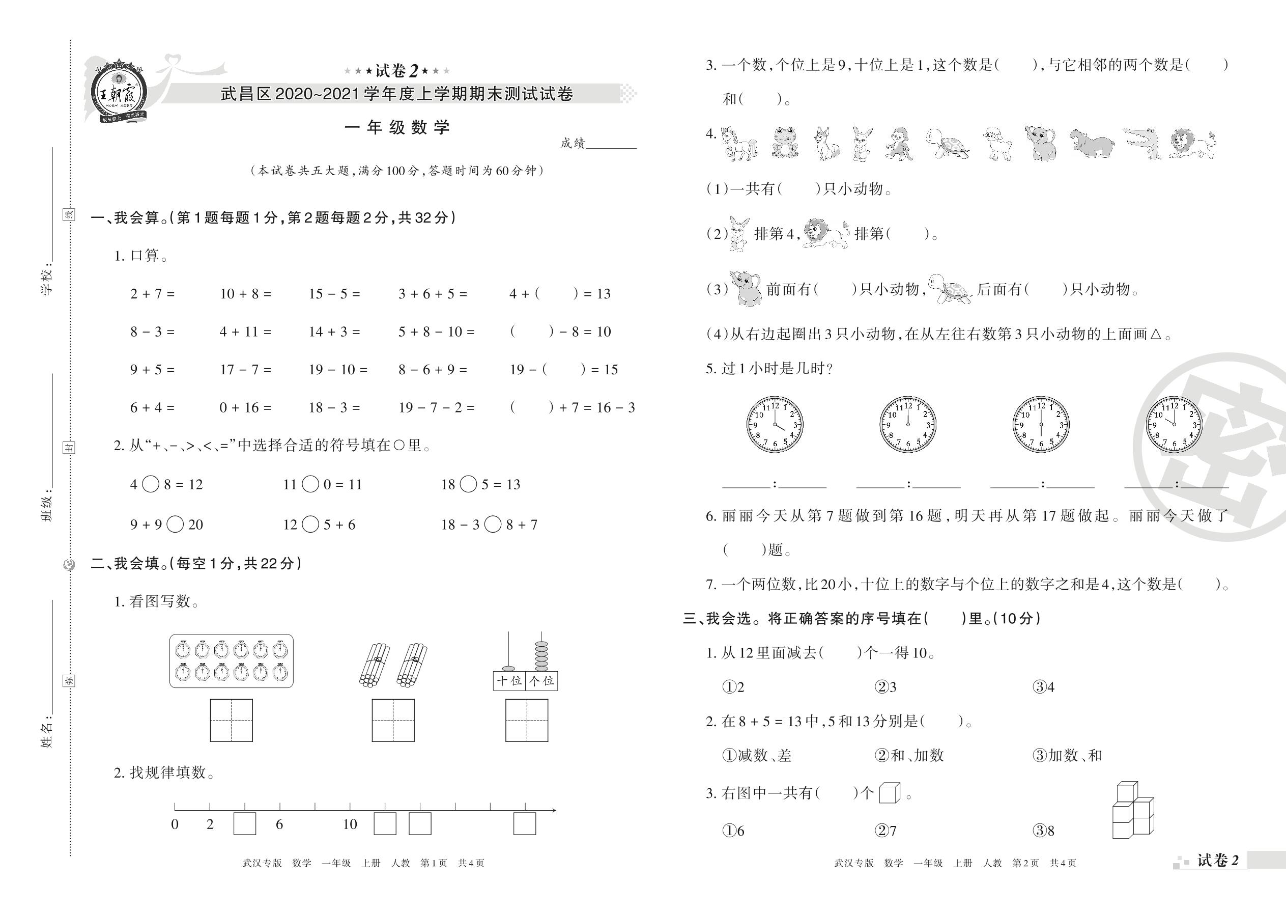 武昌区2020~2021学年度上学期期末测试试卷一年级数学(人教版)【2】