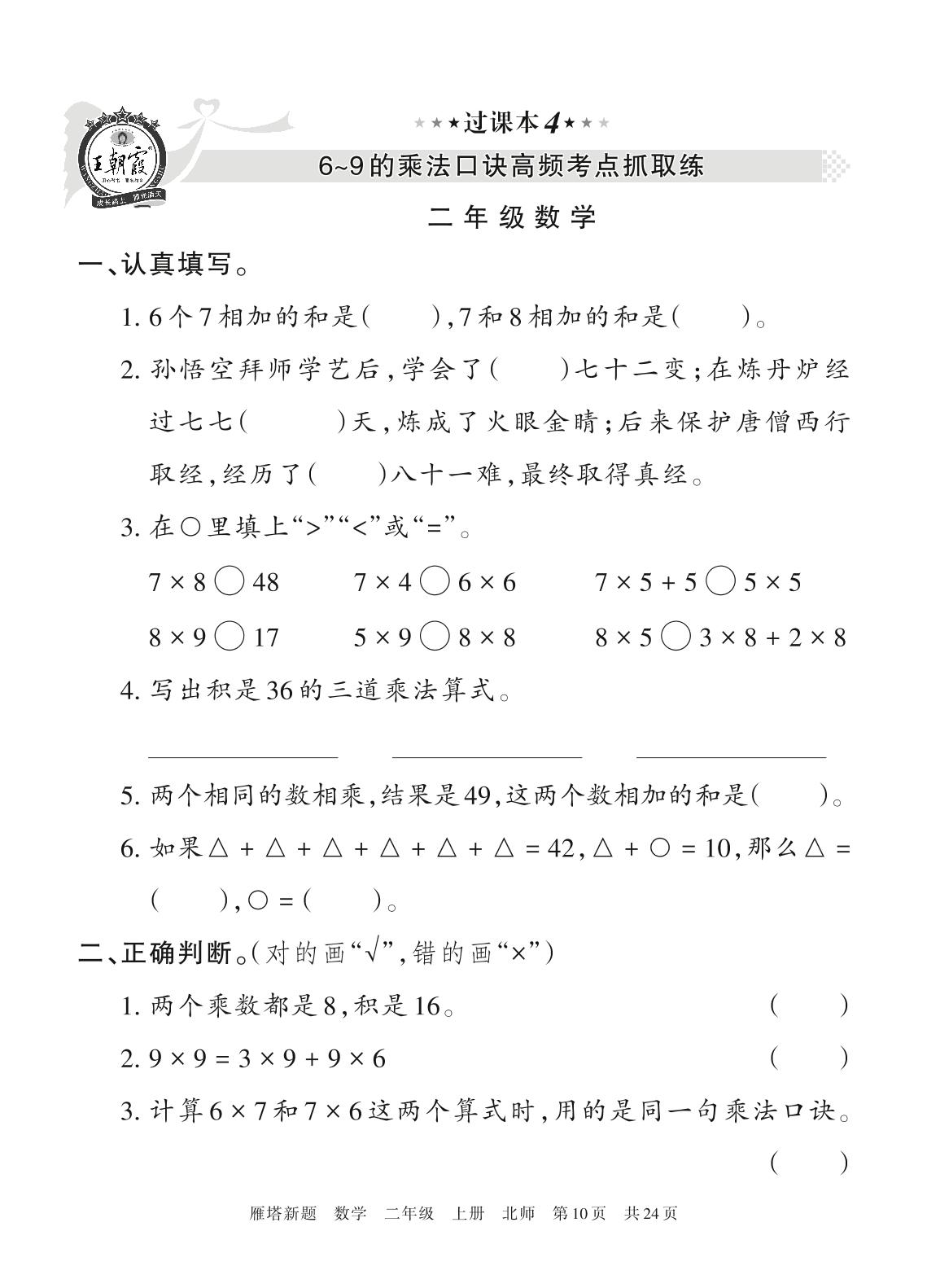 王朝霞期末过课本——6~9的乘法口诀高频考点抓取练二年级上册数学(北师版)_R211116112701615【4】