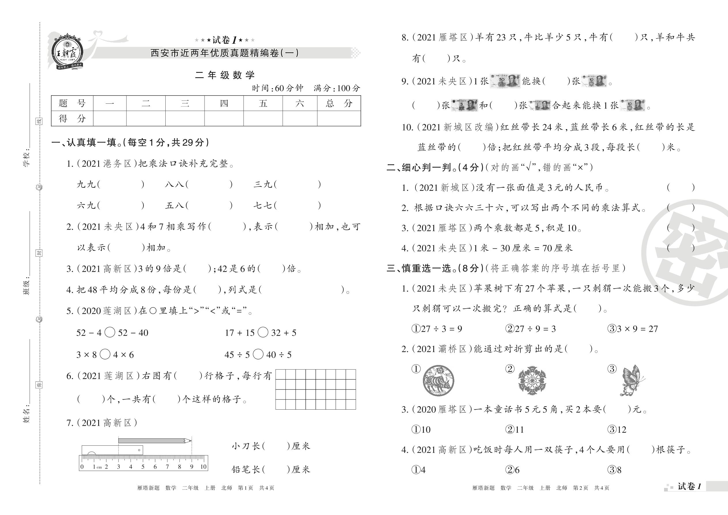 西安市近两年优质真题精编卷(一)二年级上册数学(北师版)【1】