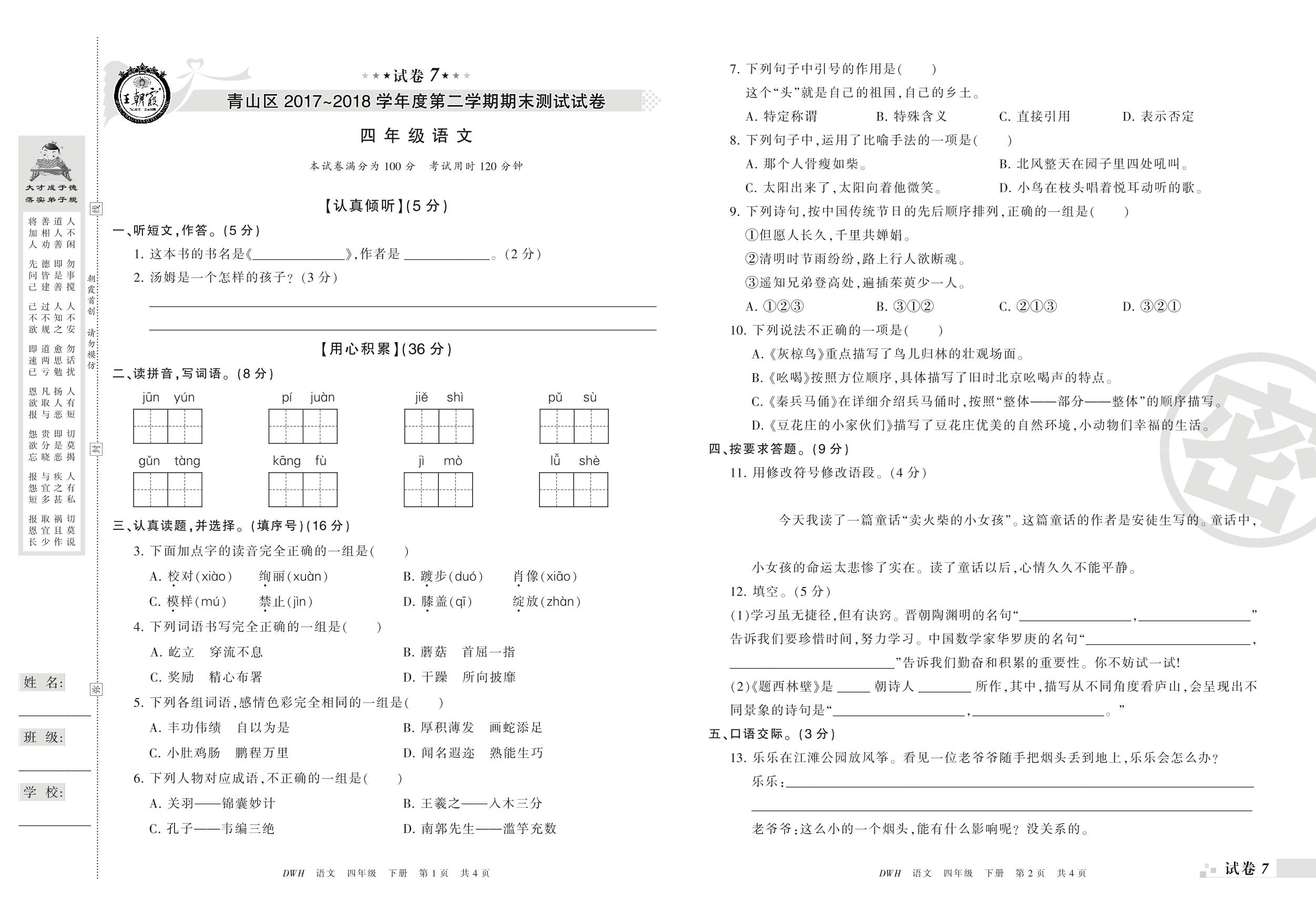 2017-2018学年第二学期武汉市青山区四年级语文试卷(鄂教版)【7】