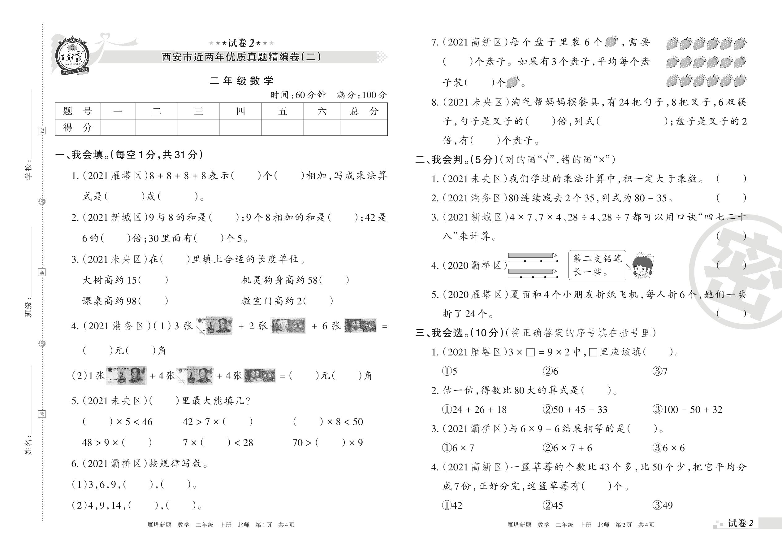 西安市近两年优质真题精编卷(二)二年级上册数学(北师版)【2】