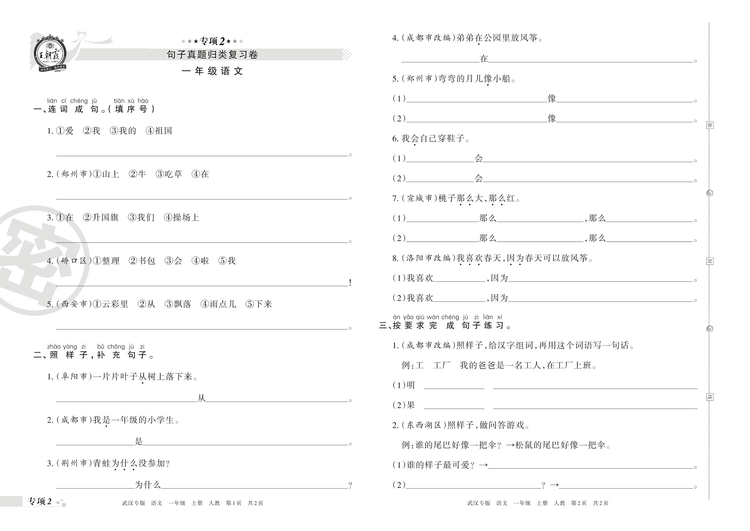 王朝霞期末专项卷——句子真题归类复习卷一年级上册语文(人教版)_R211116154038480【2】