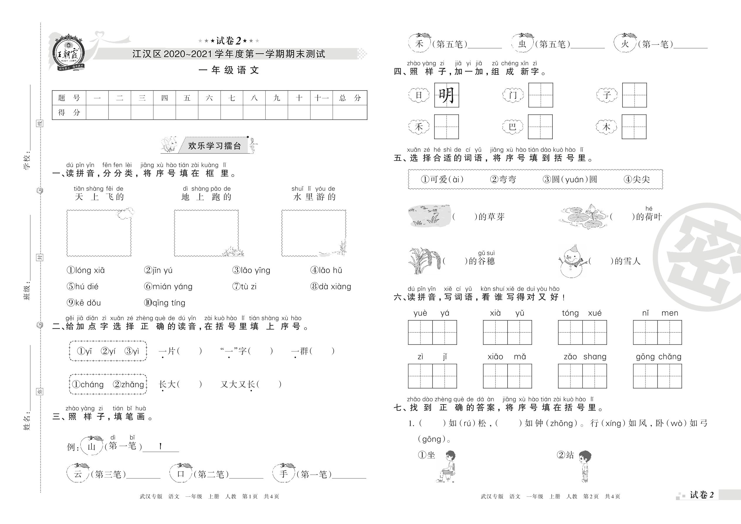 江汉区2020~2021学年度第一学期期末测试一年级语文(人教版)【2】