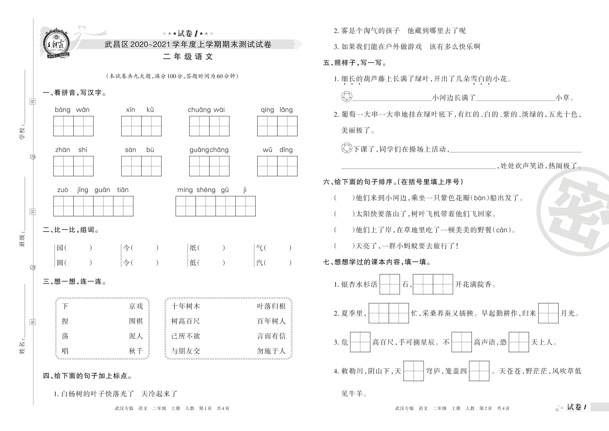 武昌区2020~2021学年度上学期期末测试试卷二年级语文(人教版)【1】