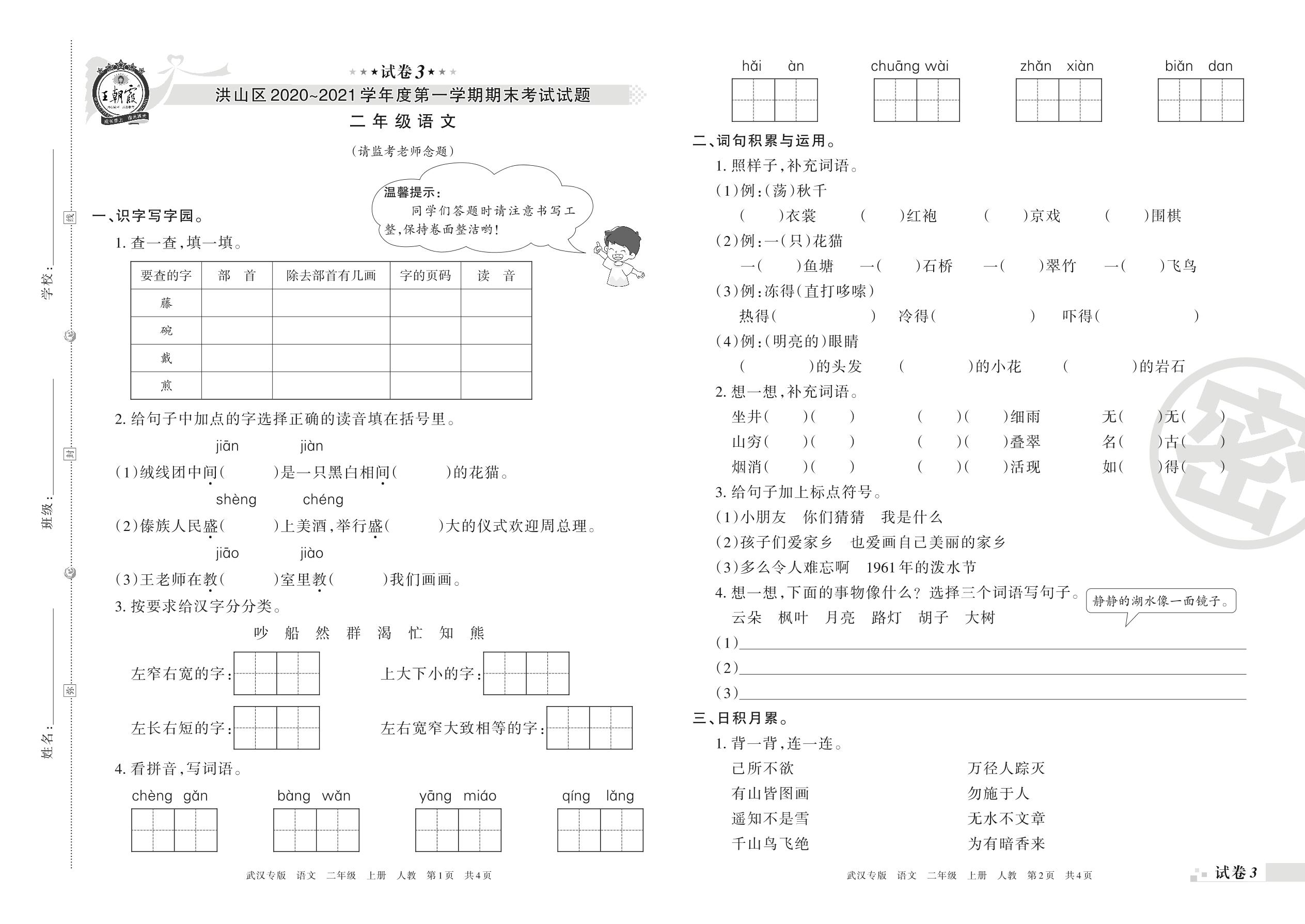 洪山区2020~2021学年度第一学期期末考试试题二年级语文(人教版)【3】
