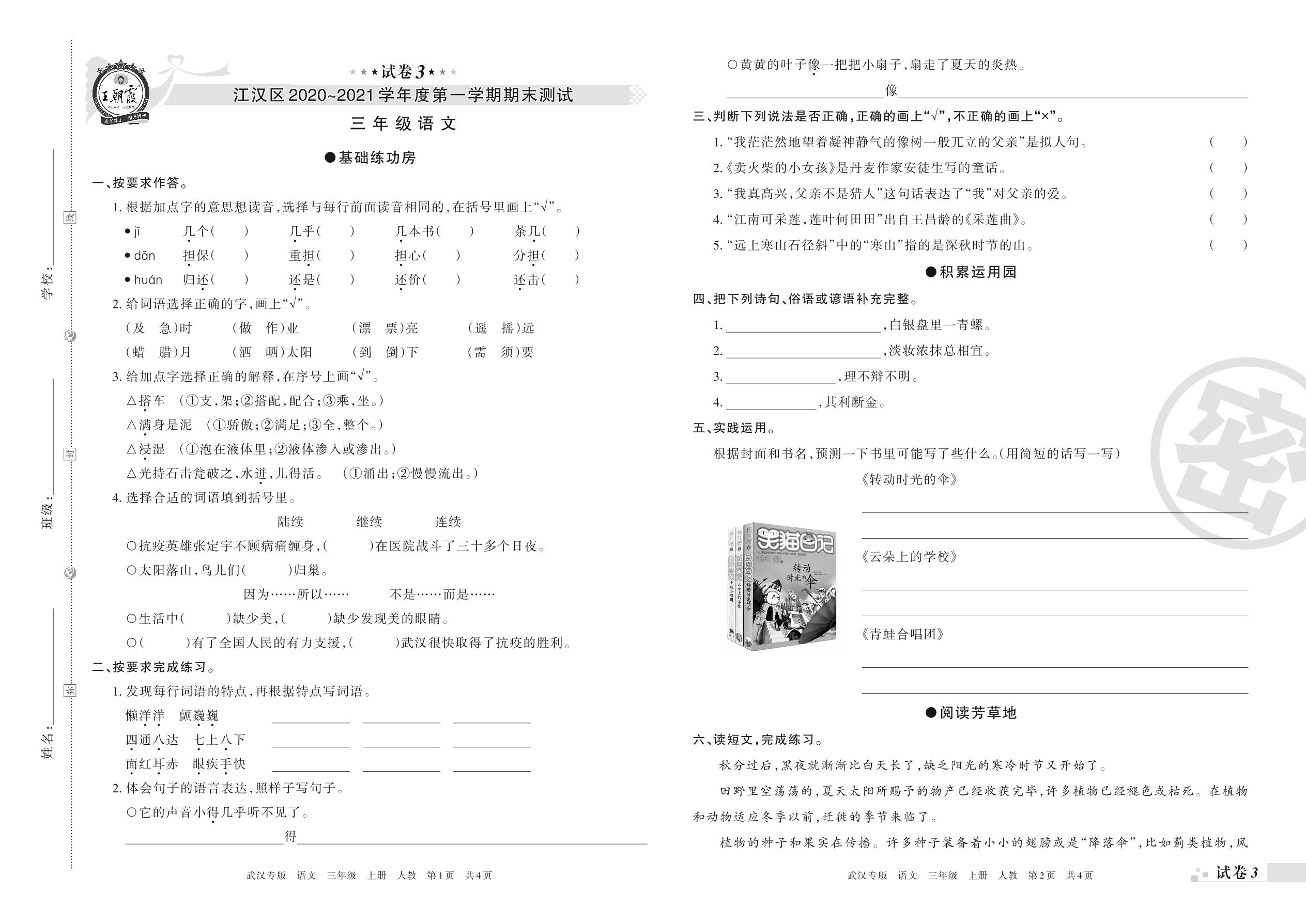 江汉区2020~2021学年度第一学期期末测试三年级语文(人教版)【3】