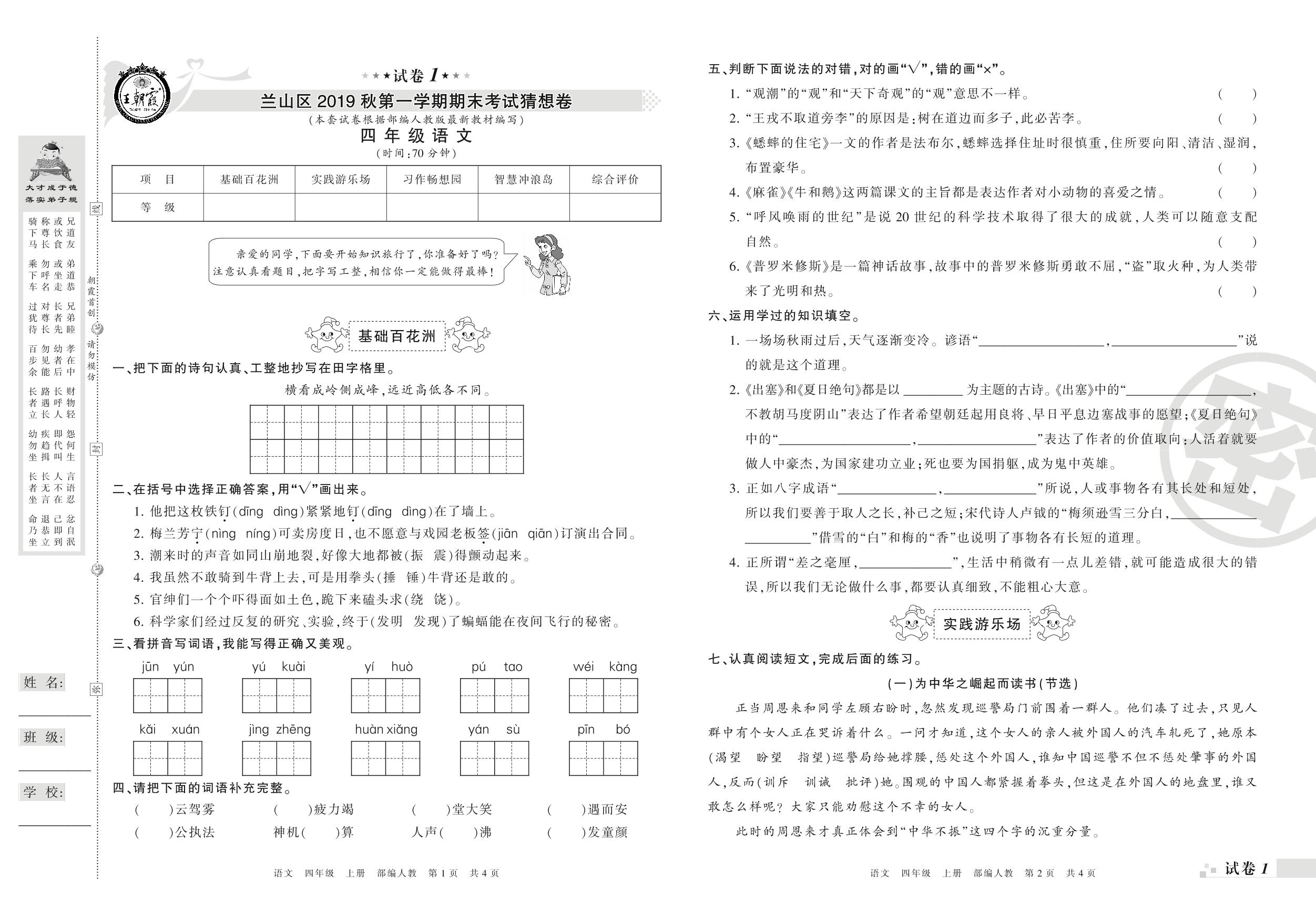 2019-2020学年第一学期临沂市兰山猜想卷区四年级语文试卷(人教版)【1】