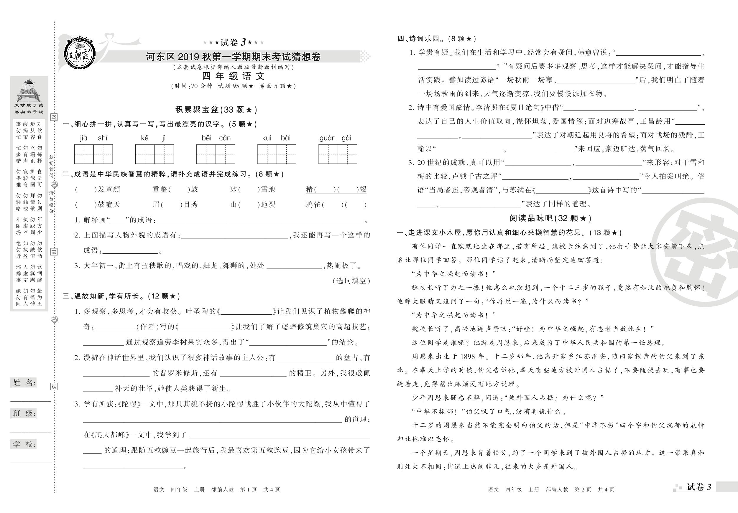2019-2020学年第一学期临沂市河东区猜想卷四年级语文试卷(人教版)【3】