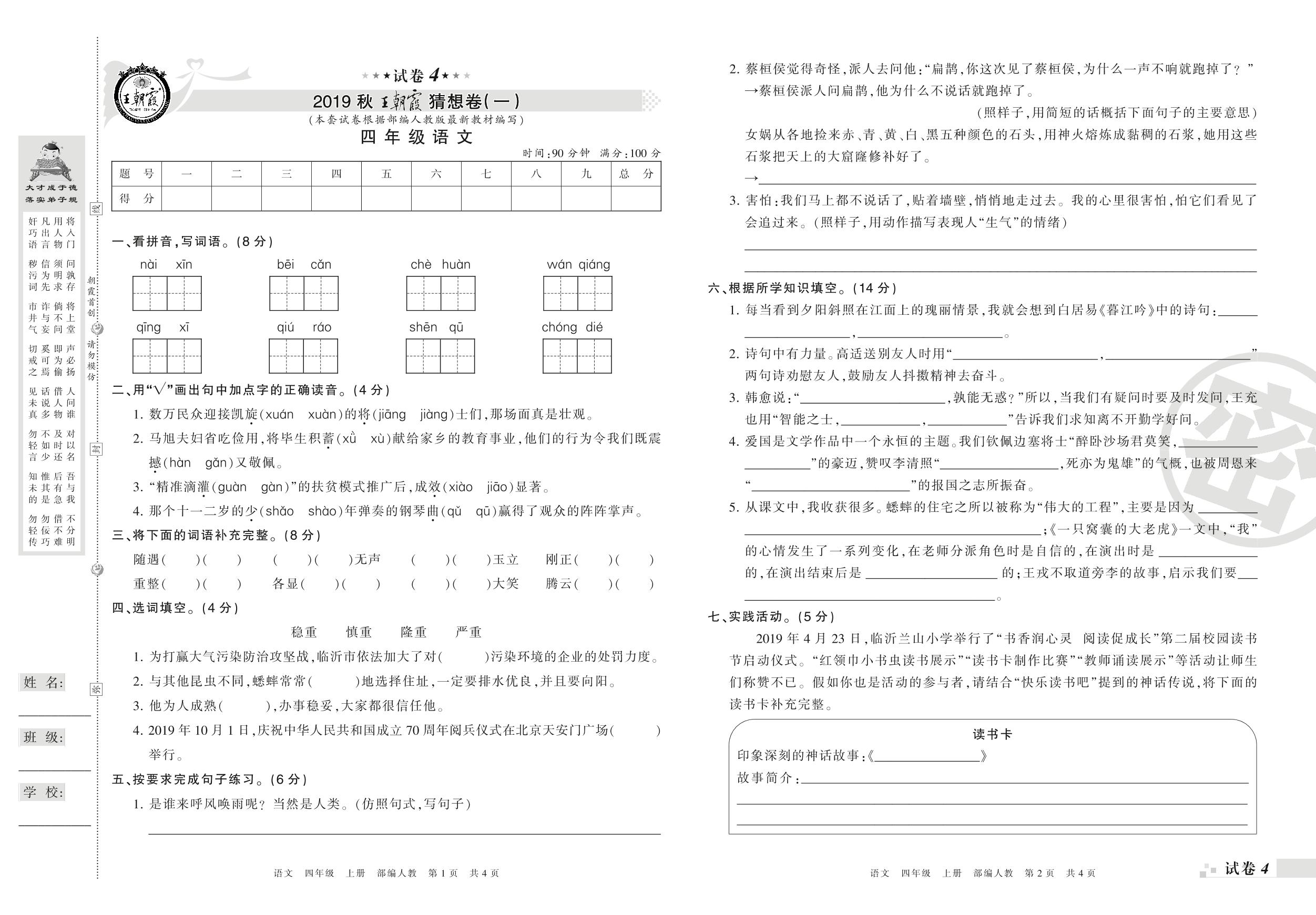 王朝霞期末猜想卷四年级上册语文(人教版)【4】