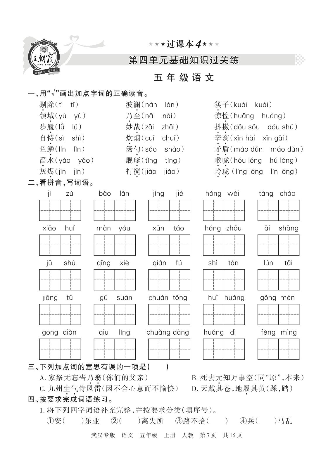 王朝霞期末过课本——第四单元基础知识过关练五年级上册语文(人教版)_R211116160106979【4】