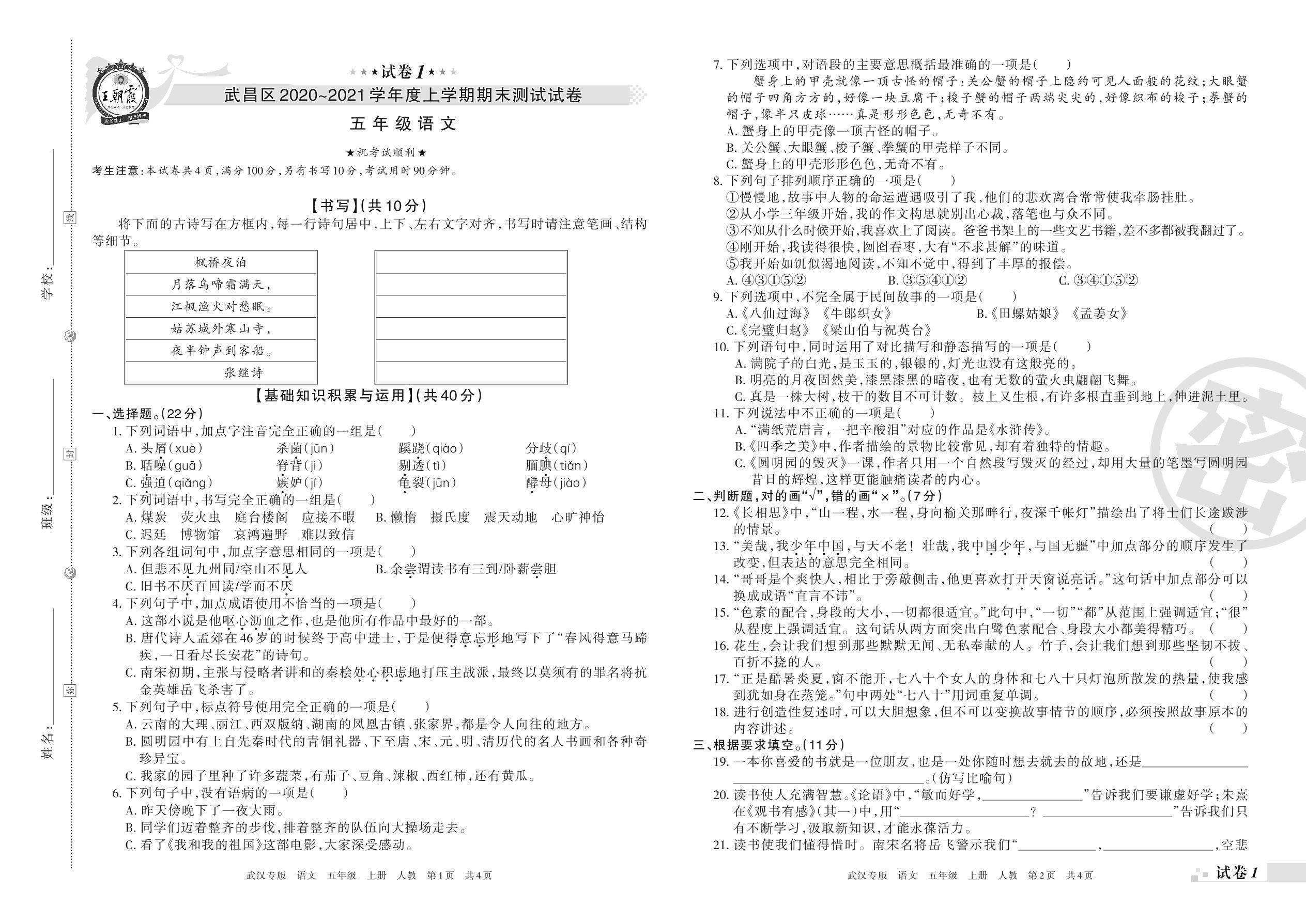 武昌区2020~2021学年度上学期期末测试试卷五年级语文(人教版)【1】
