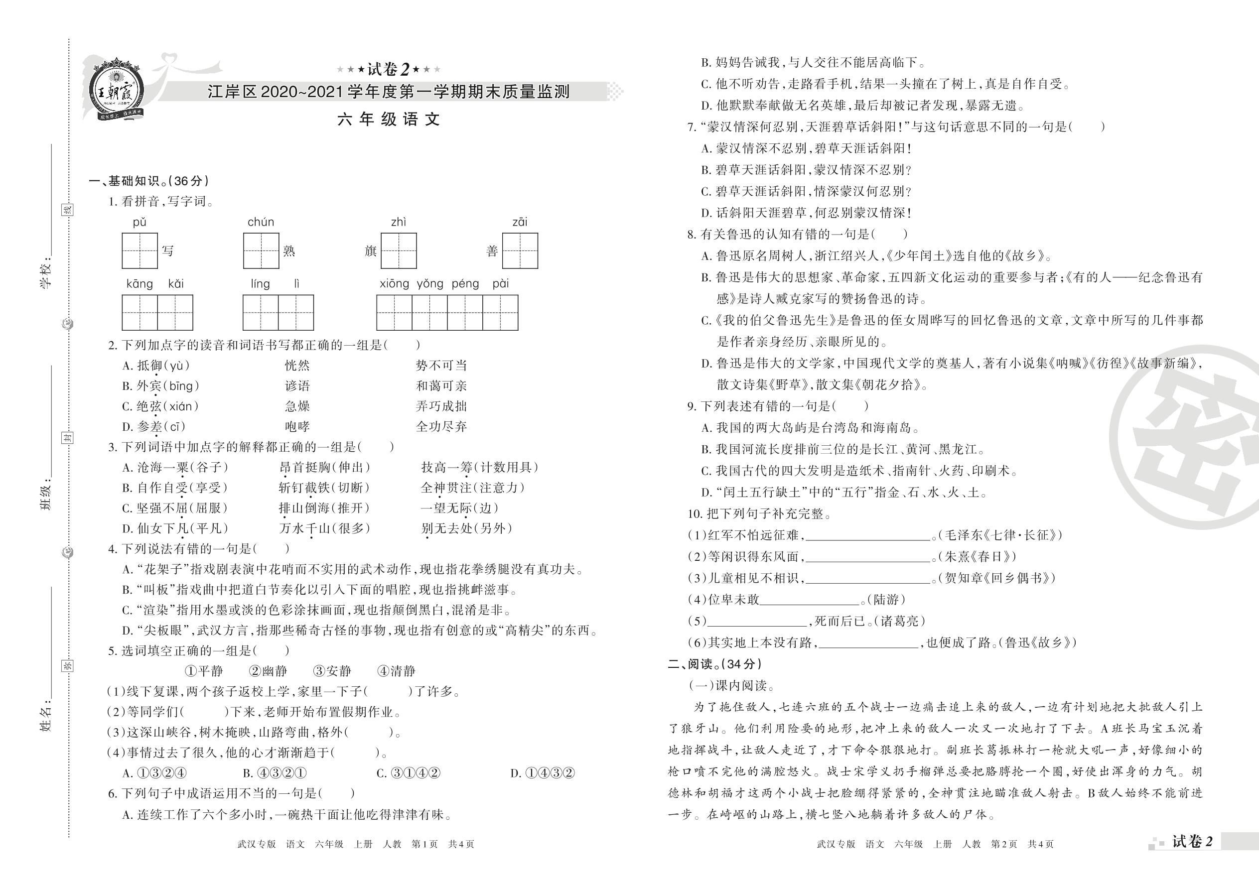江岸区2020~2021学年度第一学期期末质量监测六年级语文(人教版)【2】