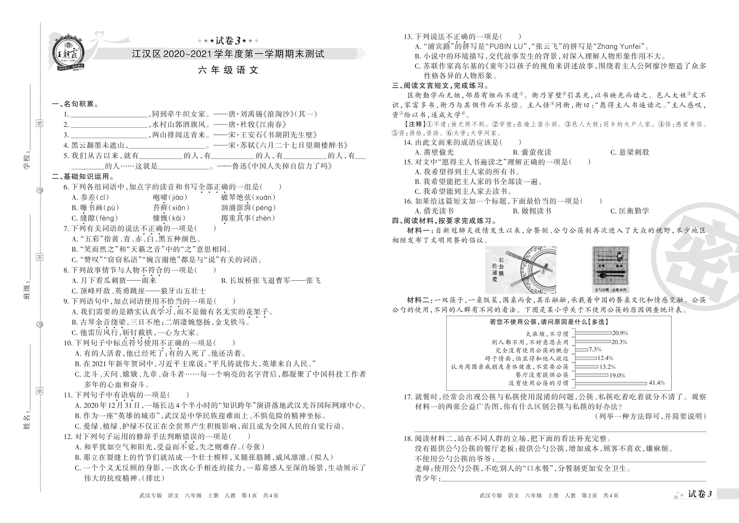江汉区2020~2021学年度第一学期期末测试六年级语文(人教版)【3】