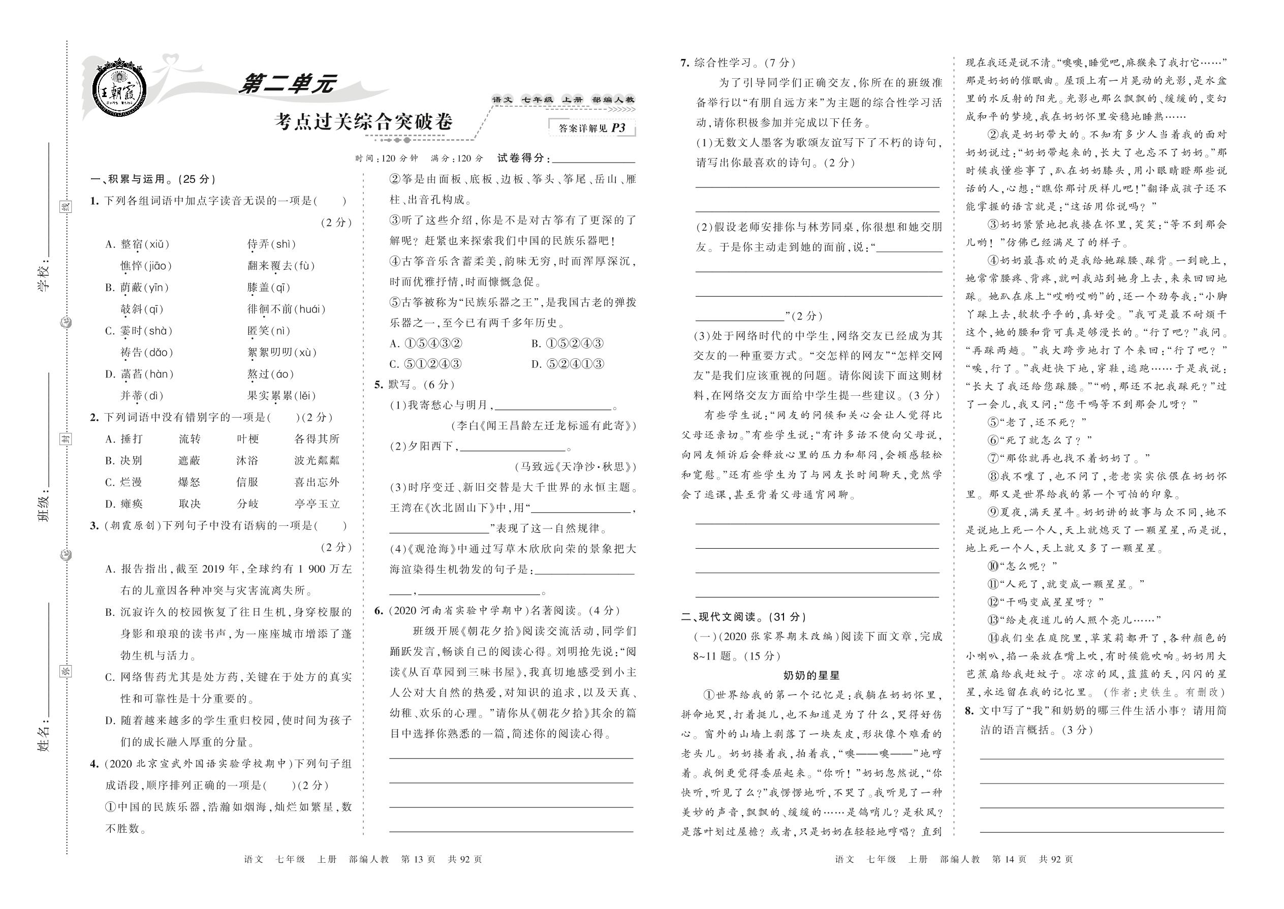 2020上册七年级语文人教版 第二单元 考点过关综合突破卷