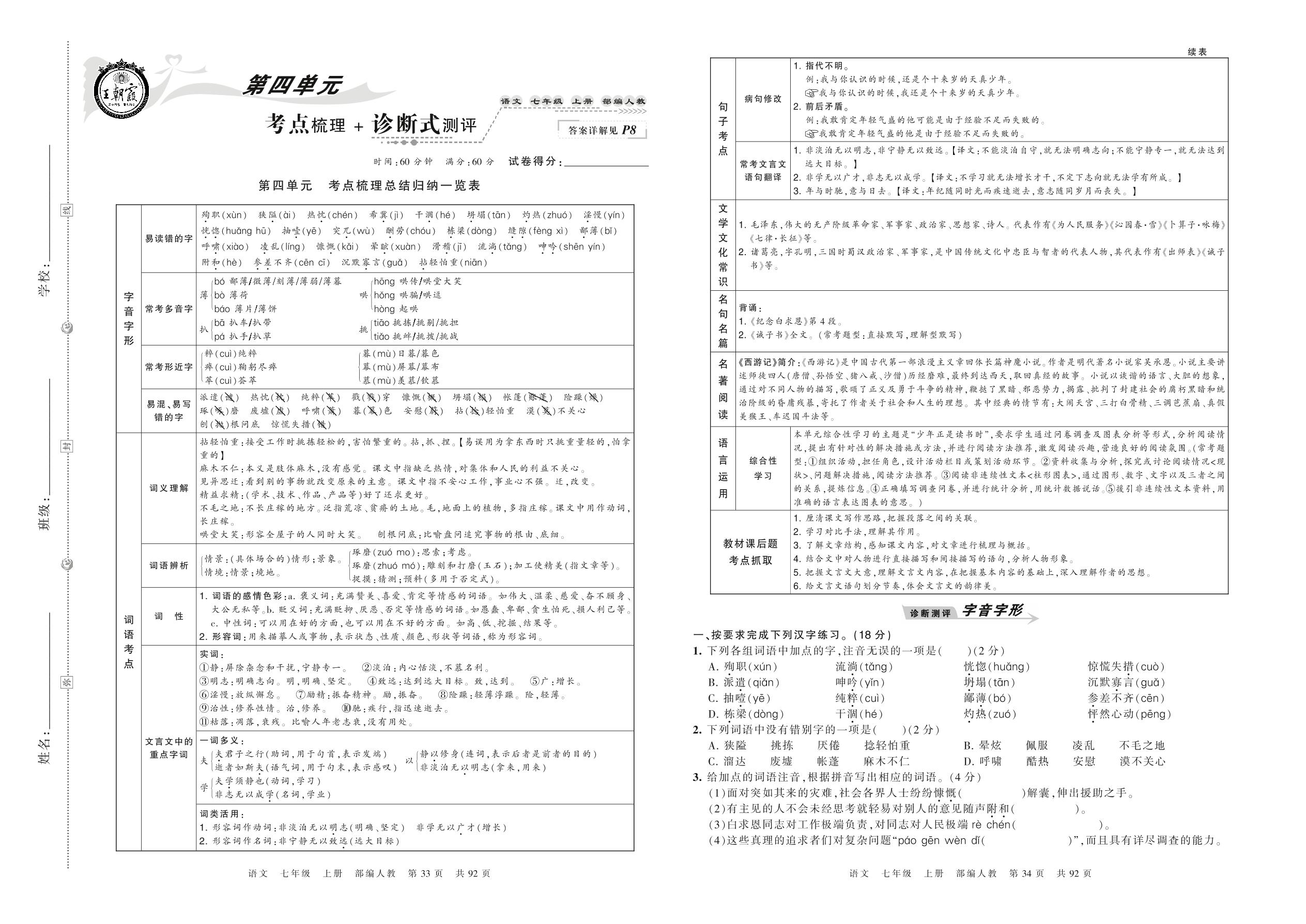 2020上册七年级语文人教版 第四单元 考点梳理+诊断式测评