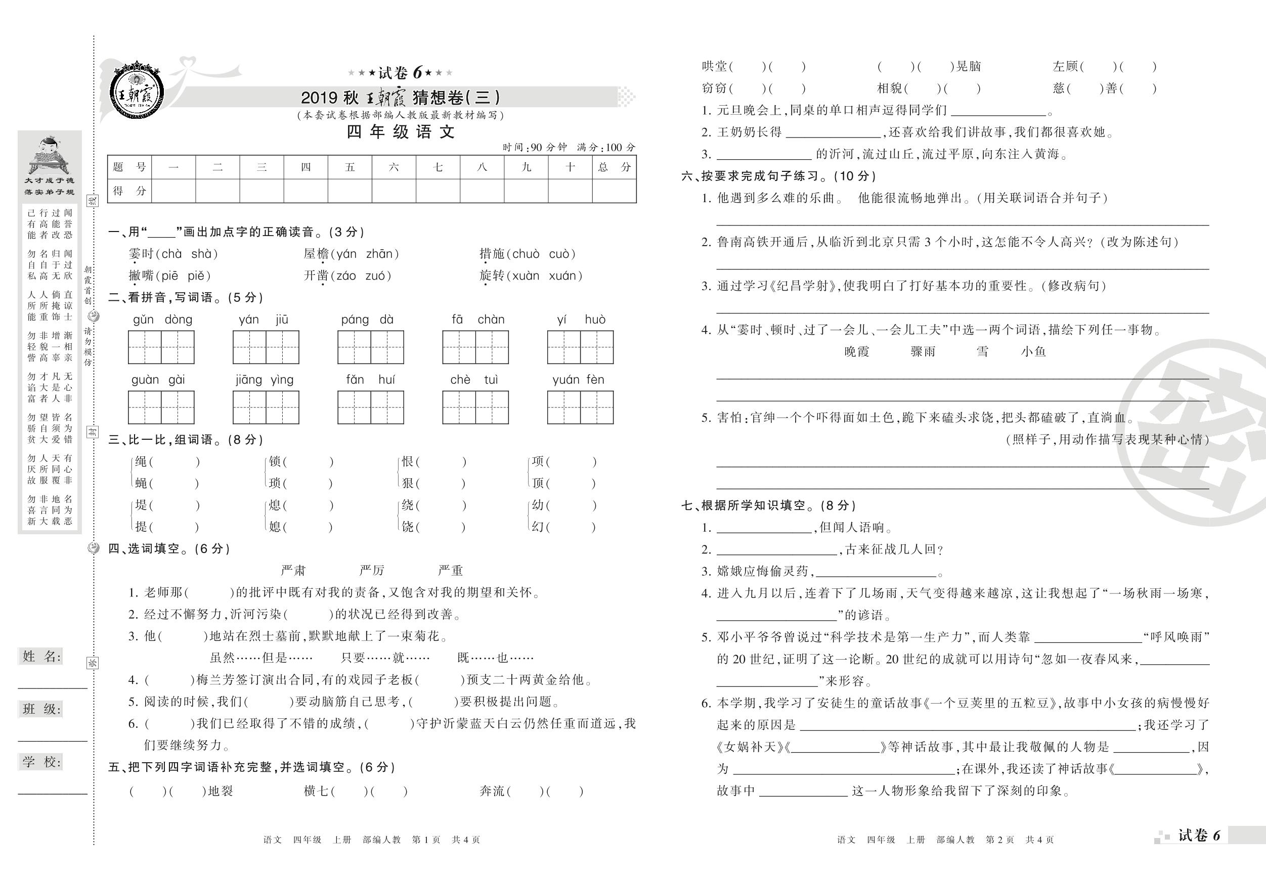 王朝霞期末猜想卷四年级上册语文(人教版)【6】